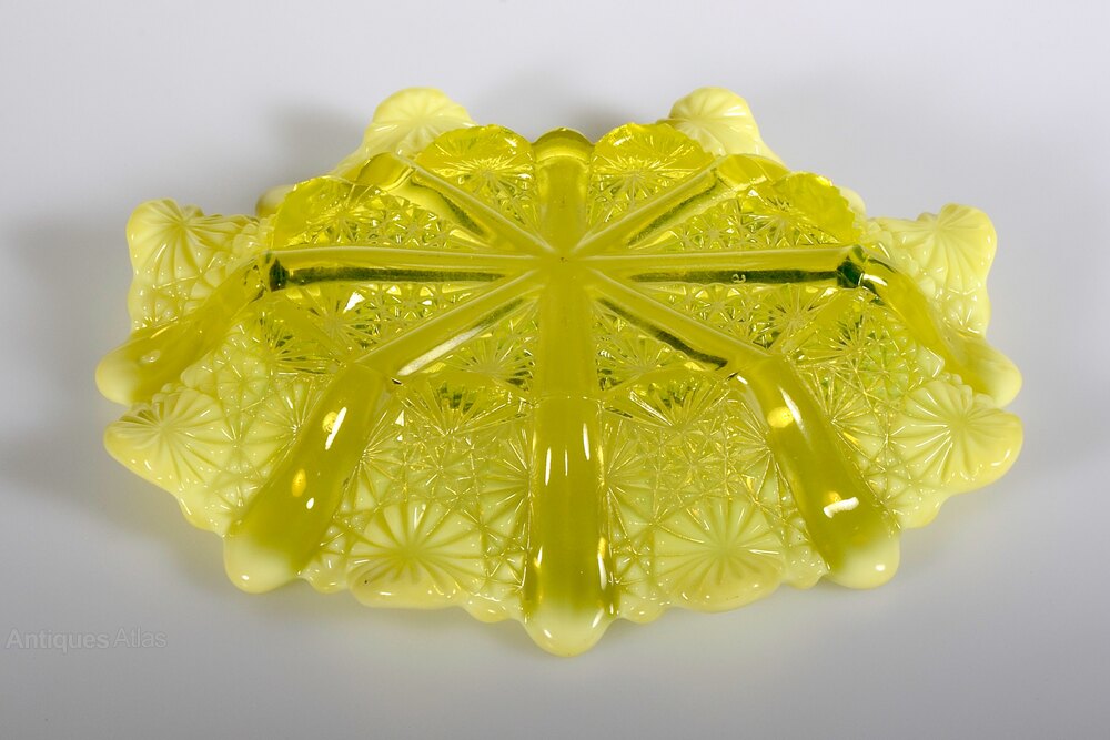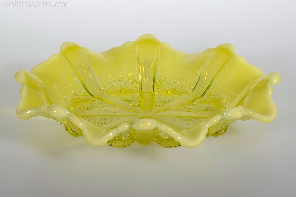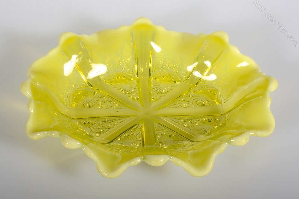 Antique Davison c1885 Primrose coloured pearline glass bowl known as Lady Chippendale Bowl reg number: 176566, primrose colour uranium glass bowl in a basket shape. Excellent Condition. H. 4cm. Dia 13cm-16cm. Rim. Dia 7cm-10cm. Base.The price includes free postage via Royal Mail Signed For delivery to the UK mainland destinations.