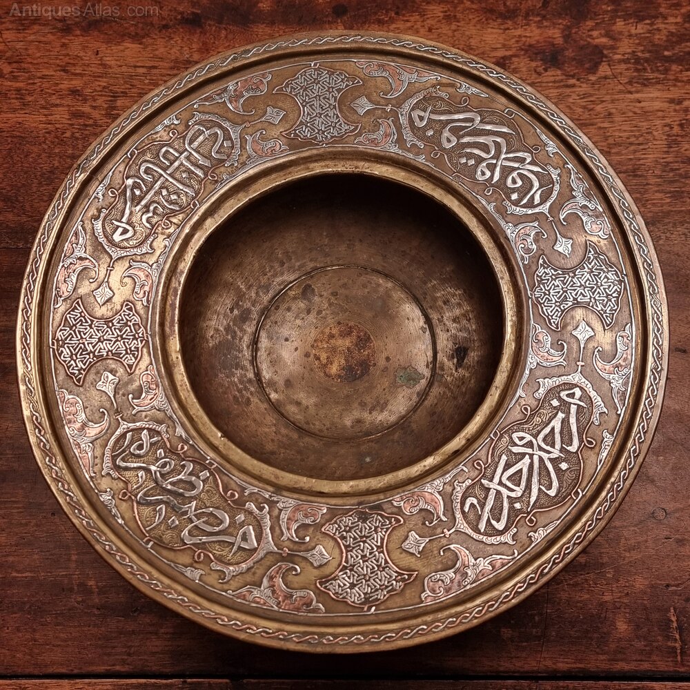 A 19th century Islamic brass wash bowl inlaid with silver damascene decorations and islamic - probably Naskh scripture.The bowl is beautifully decorated and is in excellent condition.