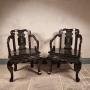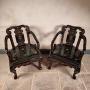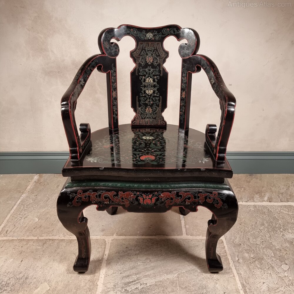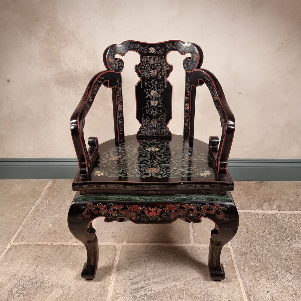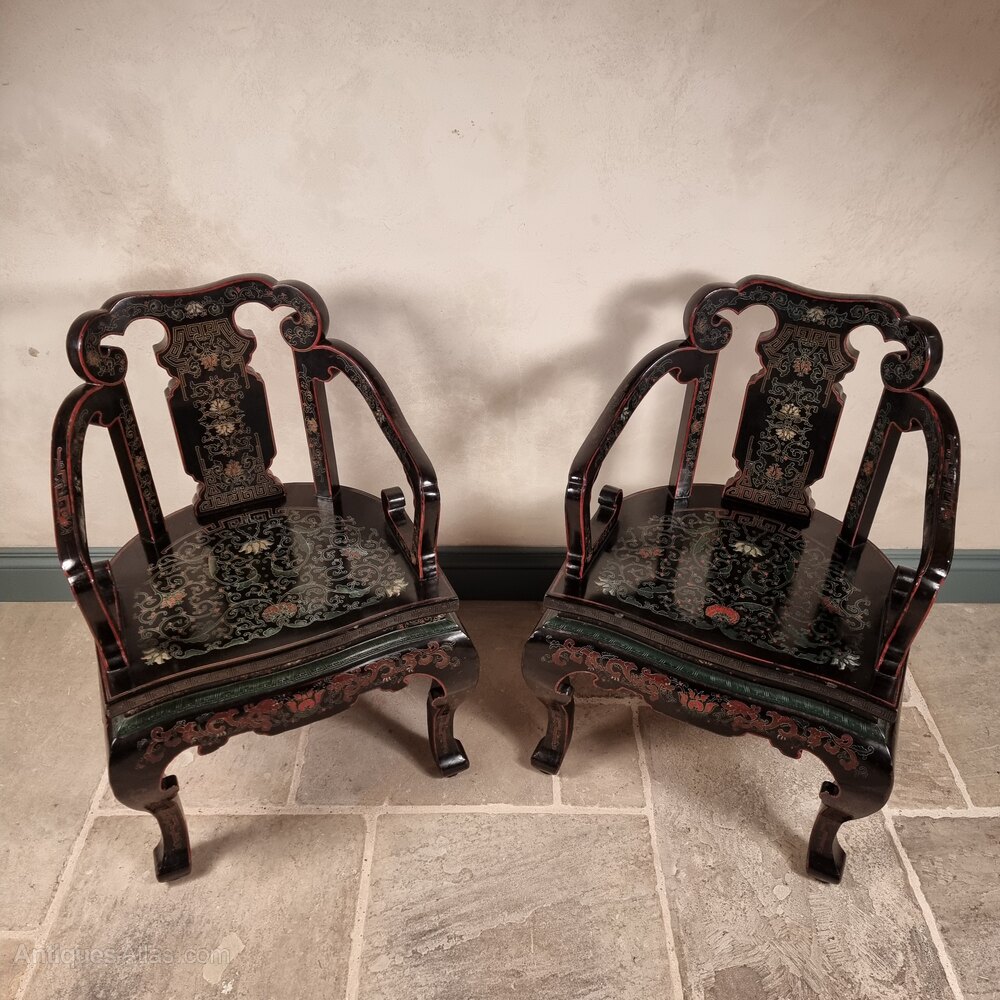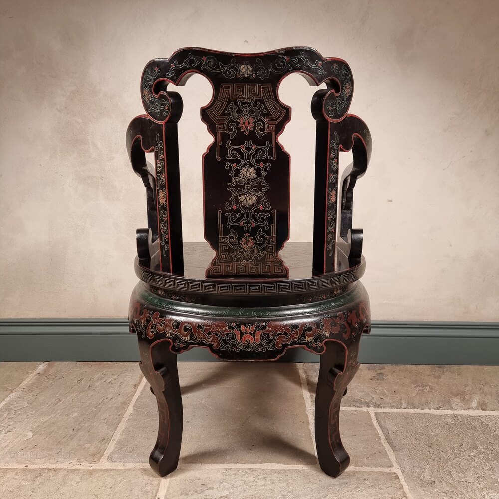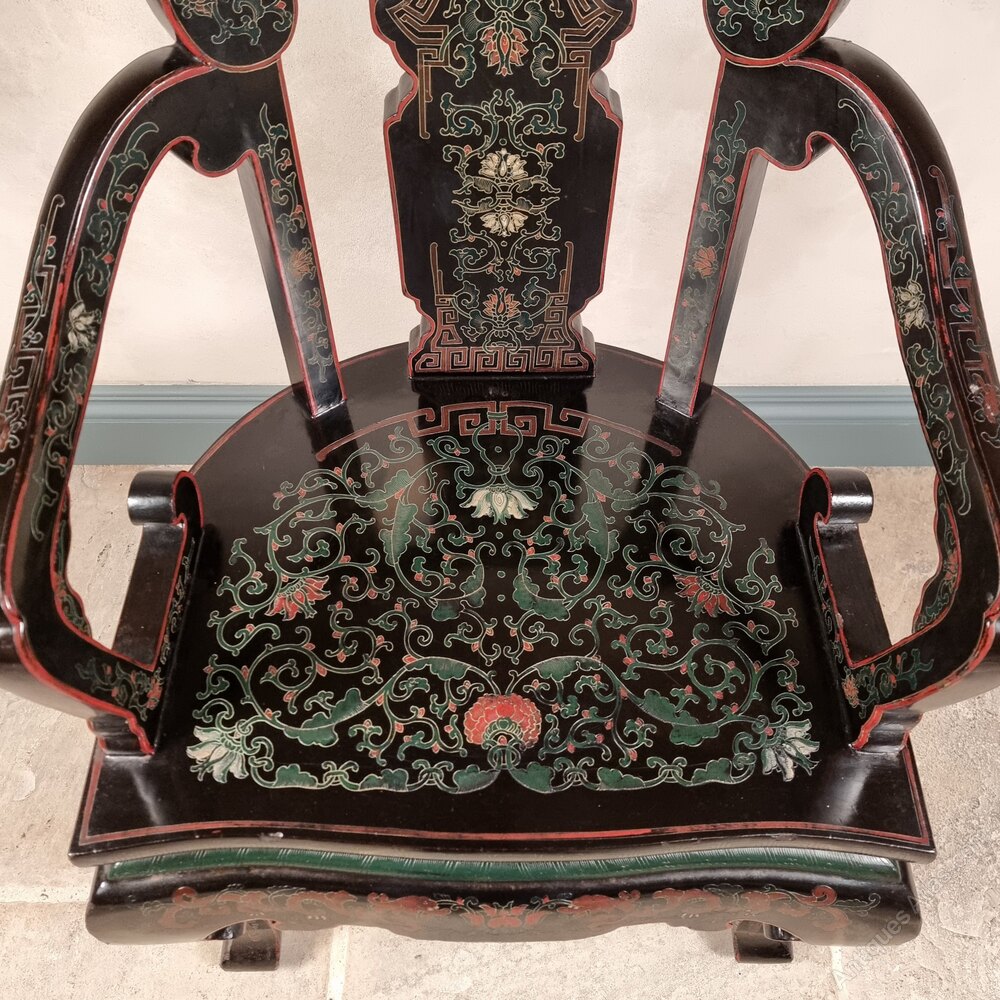 A decorative pair of 20th century black lacquered and hand painted chinese armchairs. The chairs have some age related marks chips and ware from use but overall the chairs are in great condition and are solid.Measurements