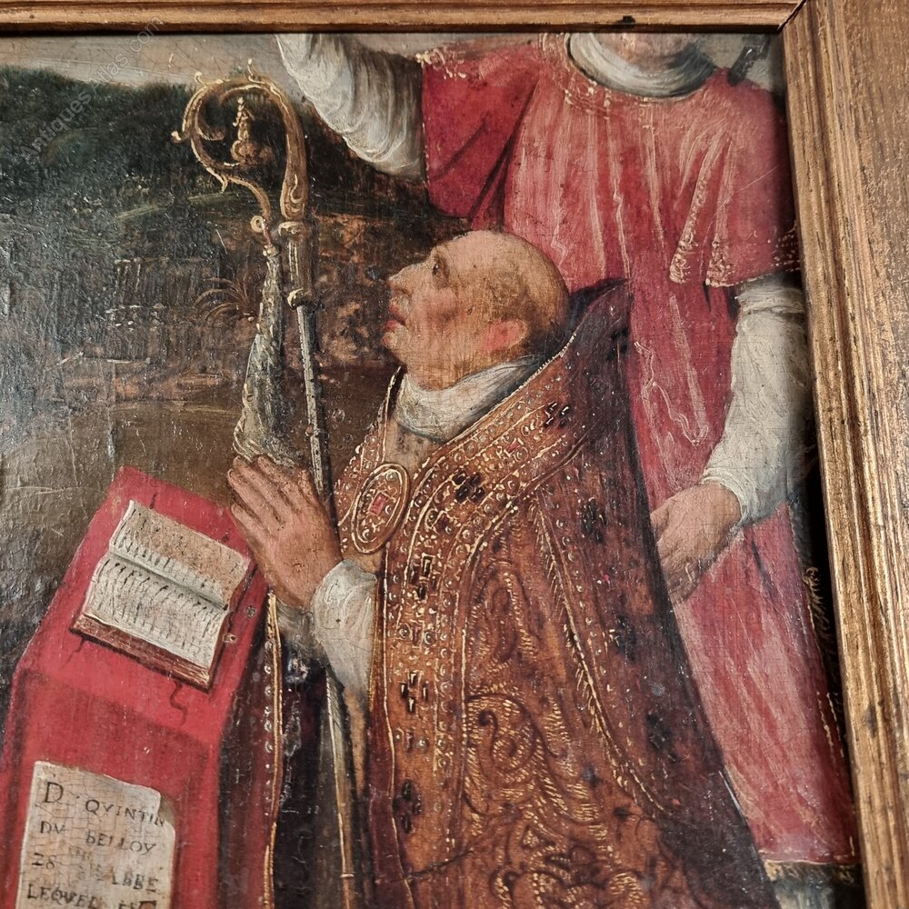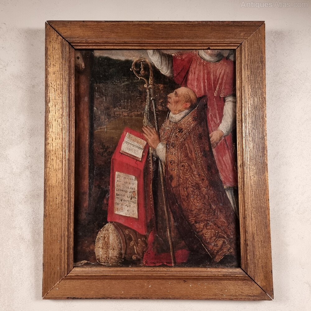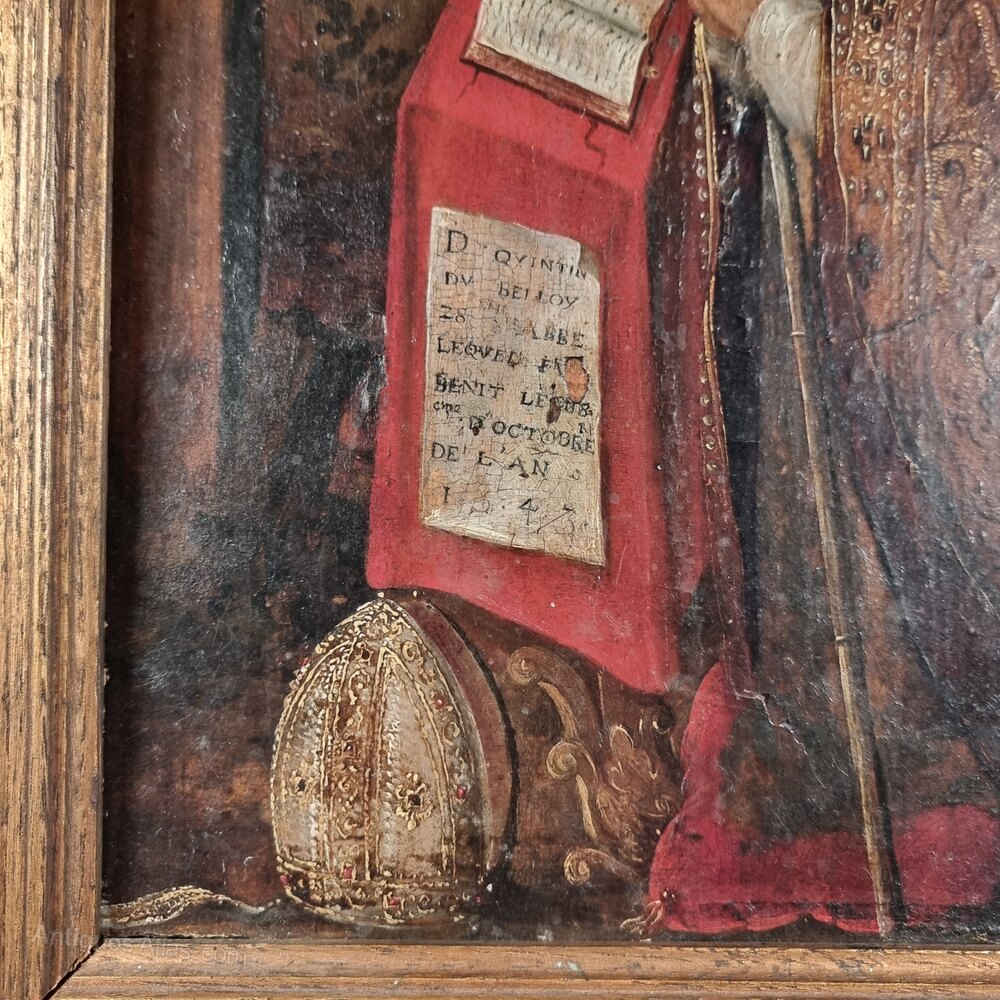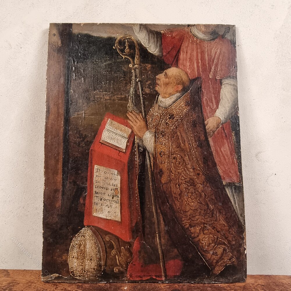 A 16th century oil on oak panel depicting a pentinent bishop kneeling and praying from the bible at the foot of the crucifixtion of christ, behind him is most likely Johannes, (saint john the apostle). The bible sits upon what is most likely a Prie-dieu with a red altar cloth draped across it, on the side of the cloth is an inscription which appears to be partly latin and french with the date 1543.The painting is beautifully painted and is a fragment of the size of what it once was, the panel has unfortunately been cut down on two sides and comes fitted in a later gilt frame.