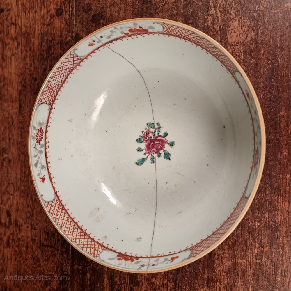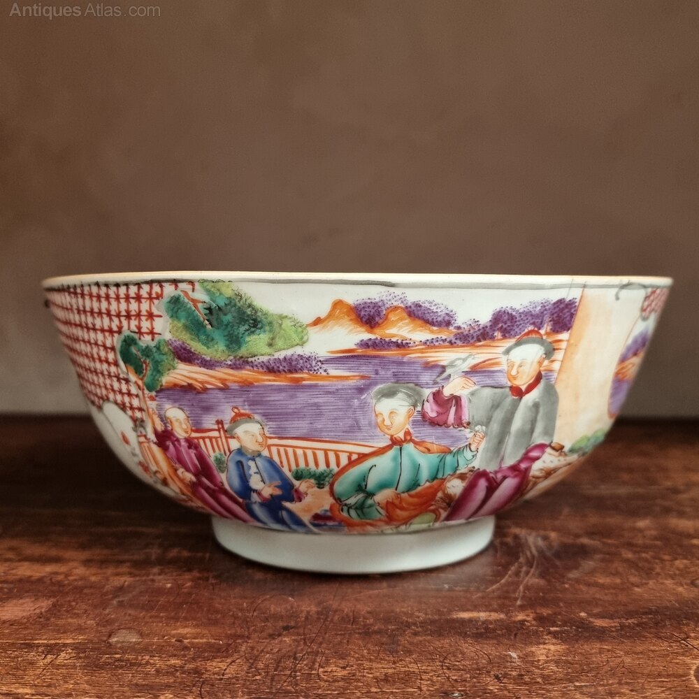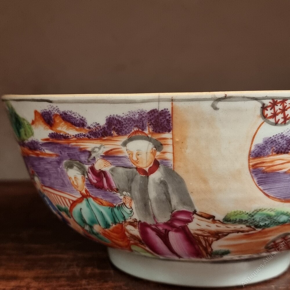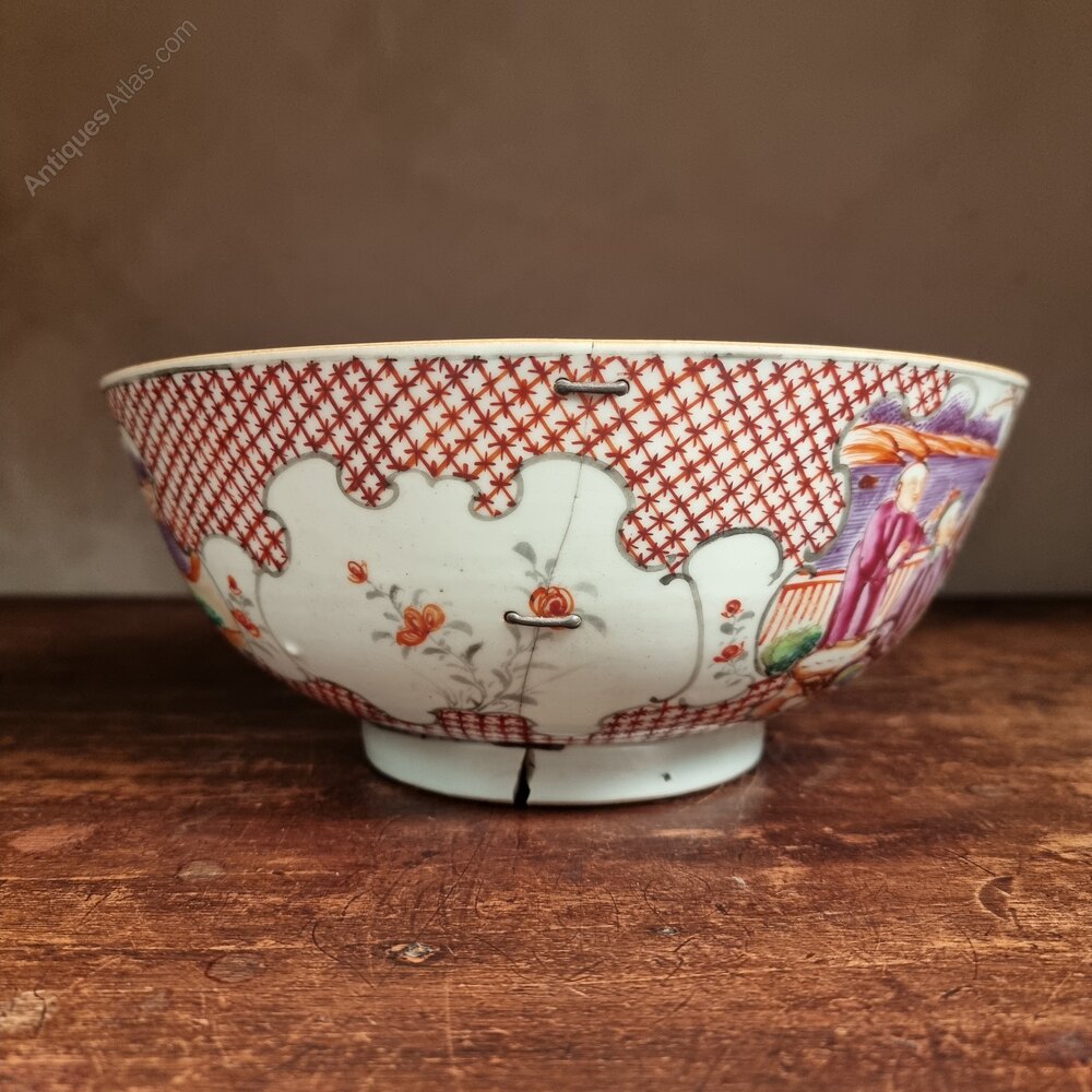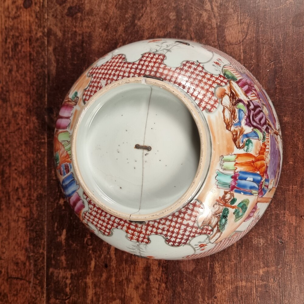 A decorative 19th century chinese bowl, finely painted with cantonese designs. The bowl has some cracks with museaum type staple repairs and a small loss to the foot of the bowl.Measurements