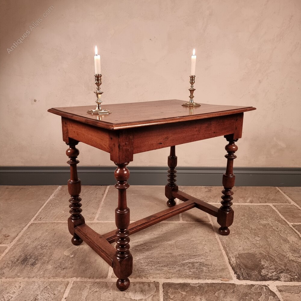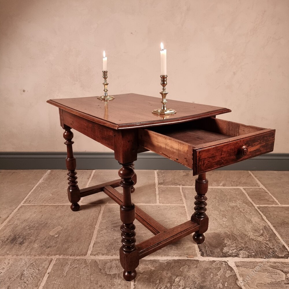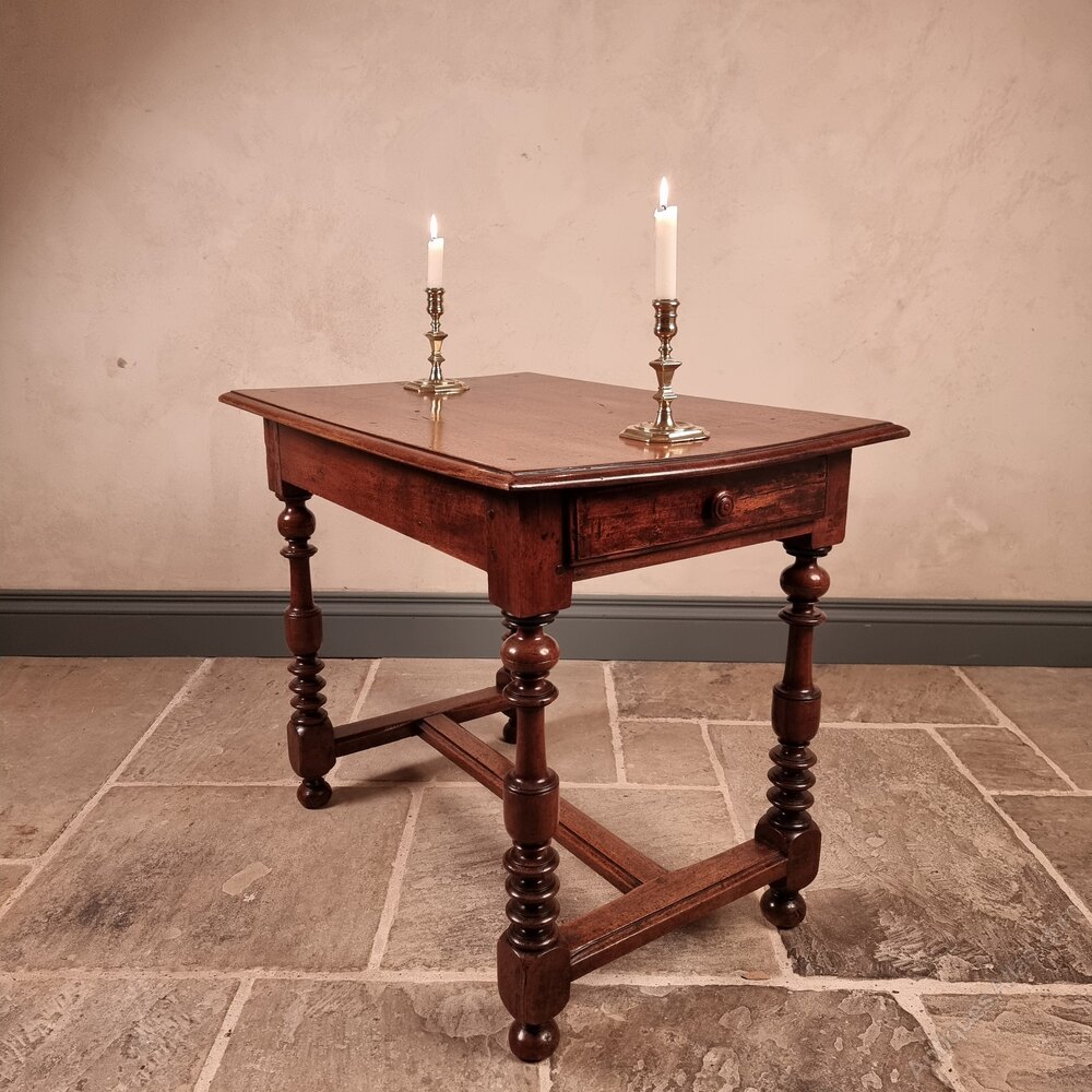 A 19th century french walnut side table with finely turned legs and H stretchers with single deep central drawer and plank top. The table has a superb colour and patination and is in excellent condition with some signs of old restorations and old wood worm which is no longer active.measurments