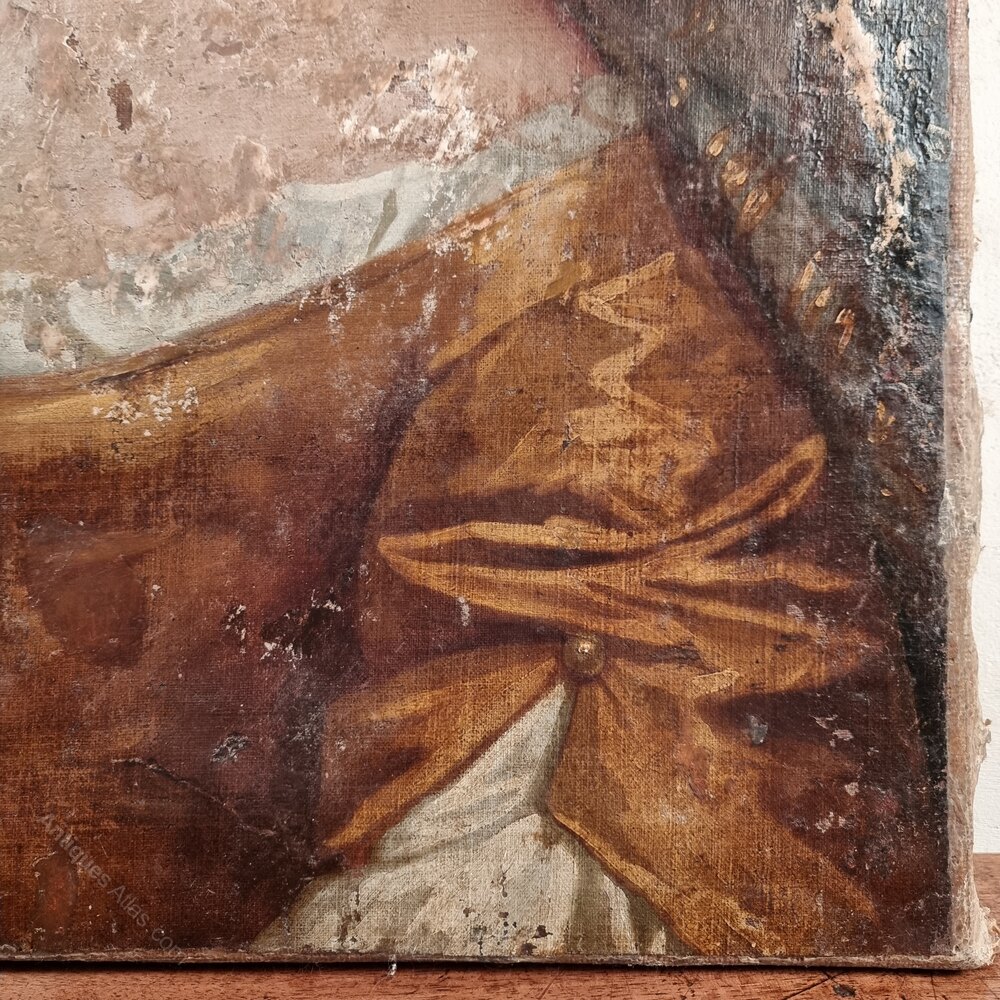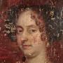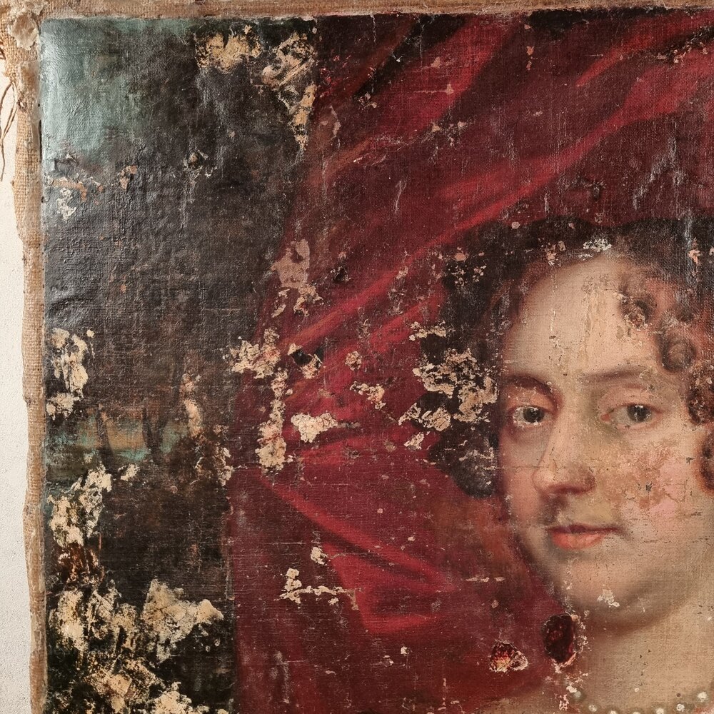 A 17th century portrait of a lady , in need of restoration. The portrait is of excellent quality and shows the height of English decadence. The lady projecting her status with her silk dress and pearl knecklace, behind her - a drapped curtain leading the veiwers eye to the italinate landscaper in the top left hand corner. The painting has been relined and restretchered, there are a number of areas with old filler, however that said, there is a superb portrait underneath it all.measurements