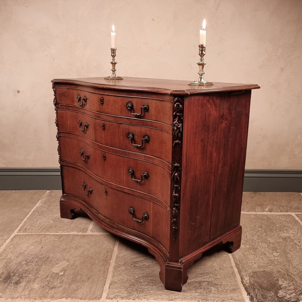 A superb 18th century chippendale period serpentine chest of drawers. The chest is constructed from walnut, mahogany and oak, and has a beautiful serpentine front and sides, the front is flanked by decorative and finely carved floral adornments, the base has a moulded skirt with bracket feet, and the drawers with cockbeading and later brassware. The chest is completely untouched and has a few losses commensurate with age. It does require some minor restoration, but is a fantastic example of refined, simple but complex 18th century english furniture.Measurements