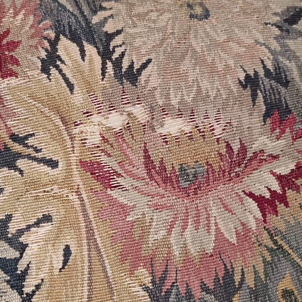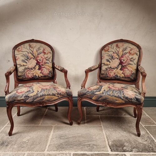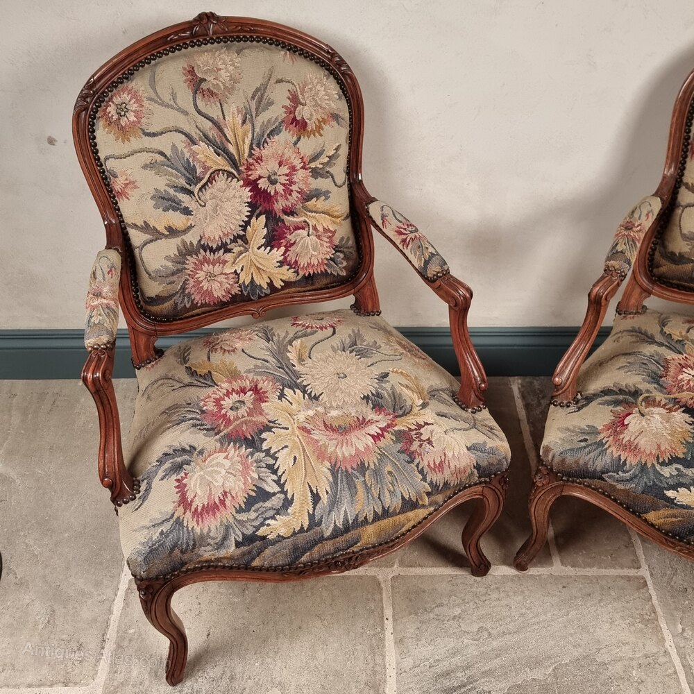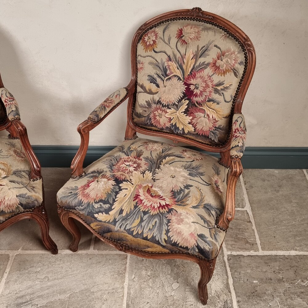 A pair of late 19th century french walnut armchairs, both upholstered in colourfully hand woven floral tapestry.The chairs are in good condition, one of the arms has a small loss of carving and there is some slight seperation in the upholstery on the seats, but both are in good usable order.