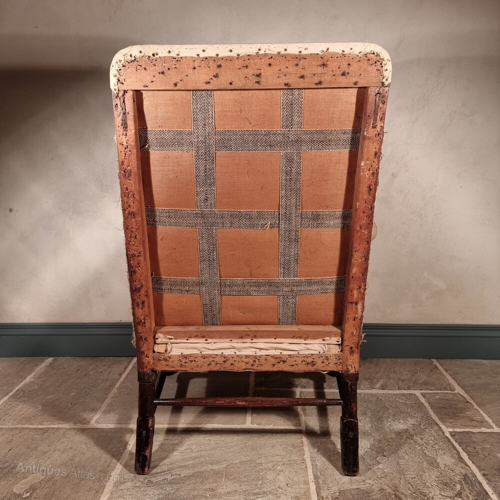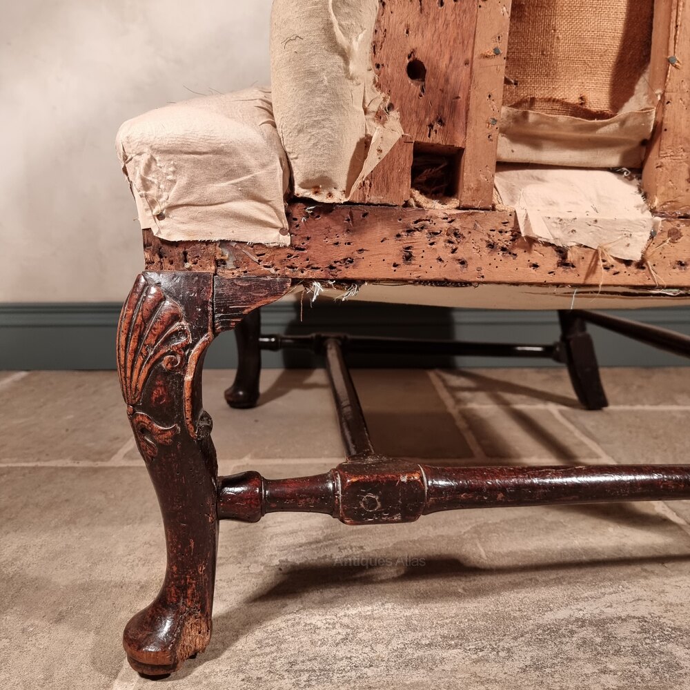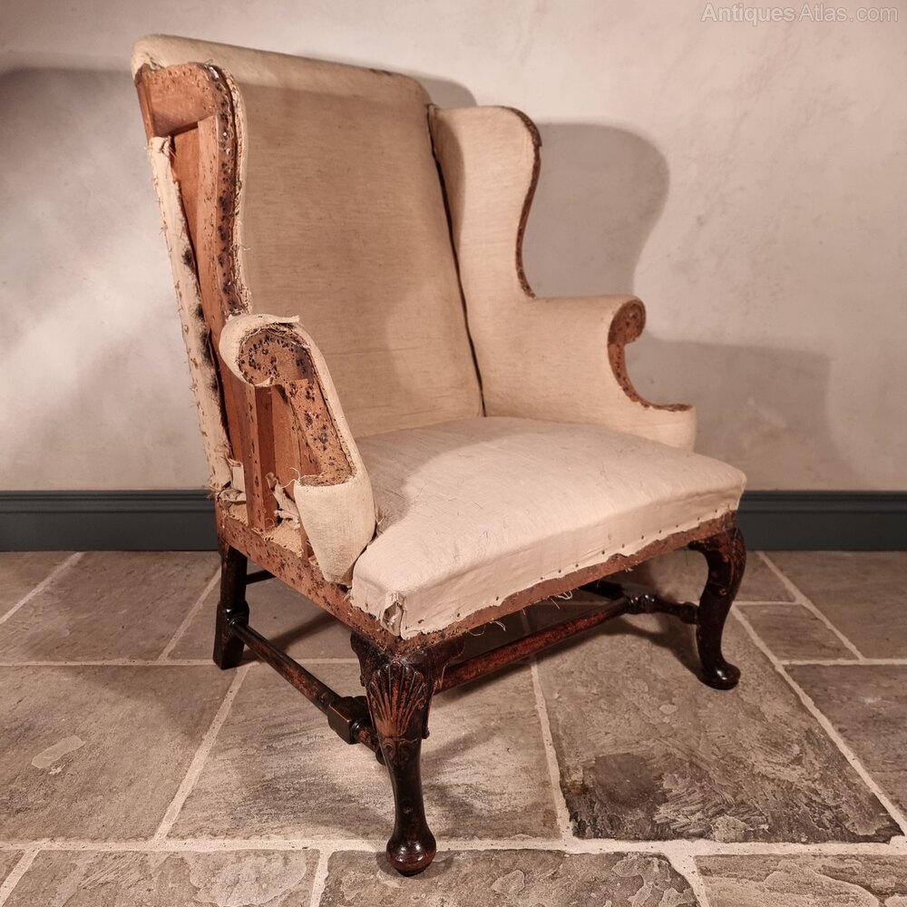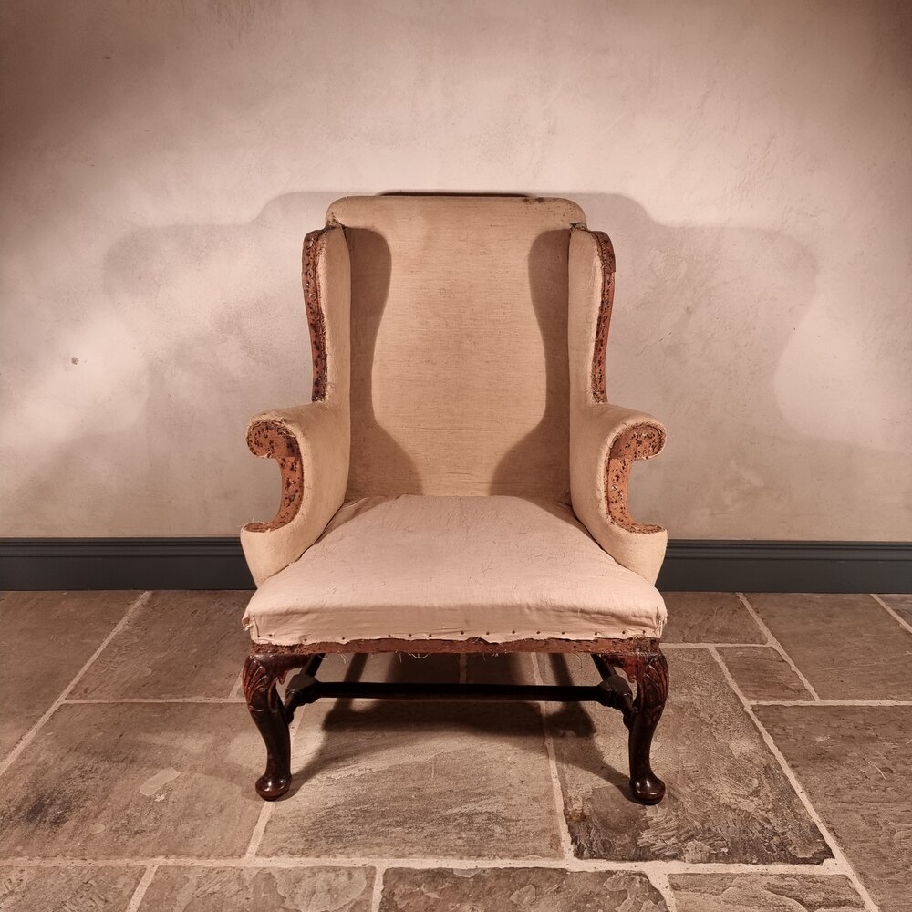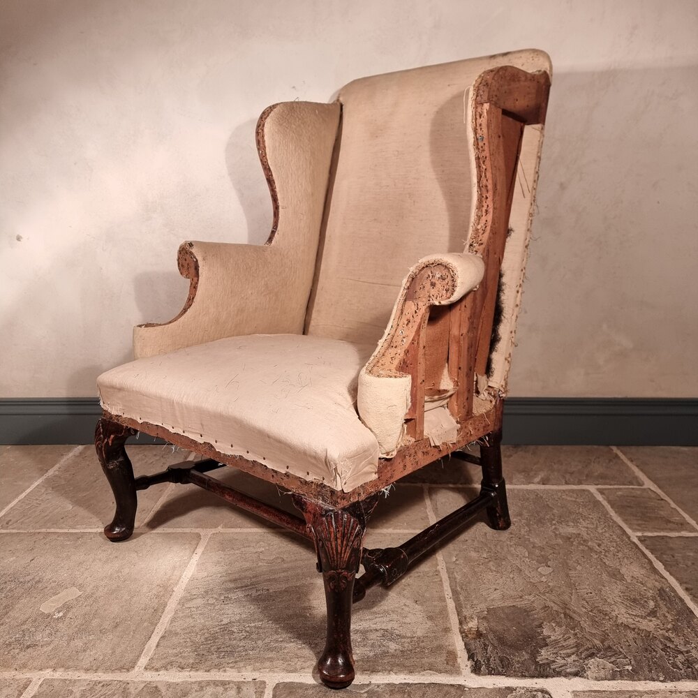 A fabulous queen anne walnut wing chair in untouched original condition, the cabriole legs having pad feet and carved scallop shell knees. The surface of the timber has a lovely cruddy dark patine with the rubbed raised area having the deep rich red patina of the walnut coming through. The chair has a number of old restorations and requires some minor restoration. It does have wood worm in a few areas commensurate with age, and it requires reupholstery. The chair is in good solid order and it is quite rare to come across a genuine queen anne wing chair, this is an excellent example for any serious collector of early 18th century english furniture.Overall measurements