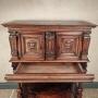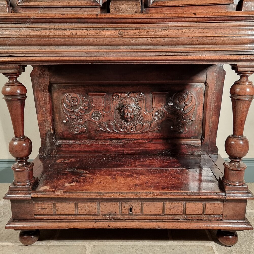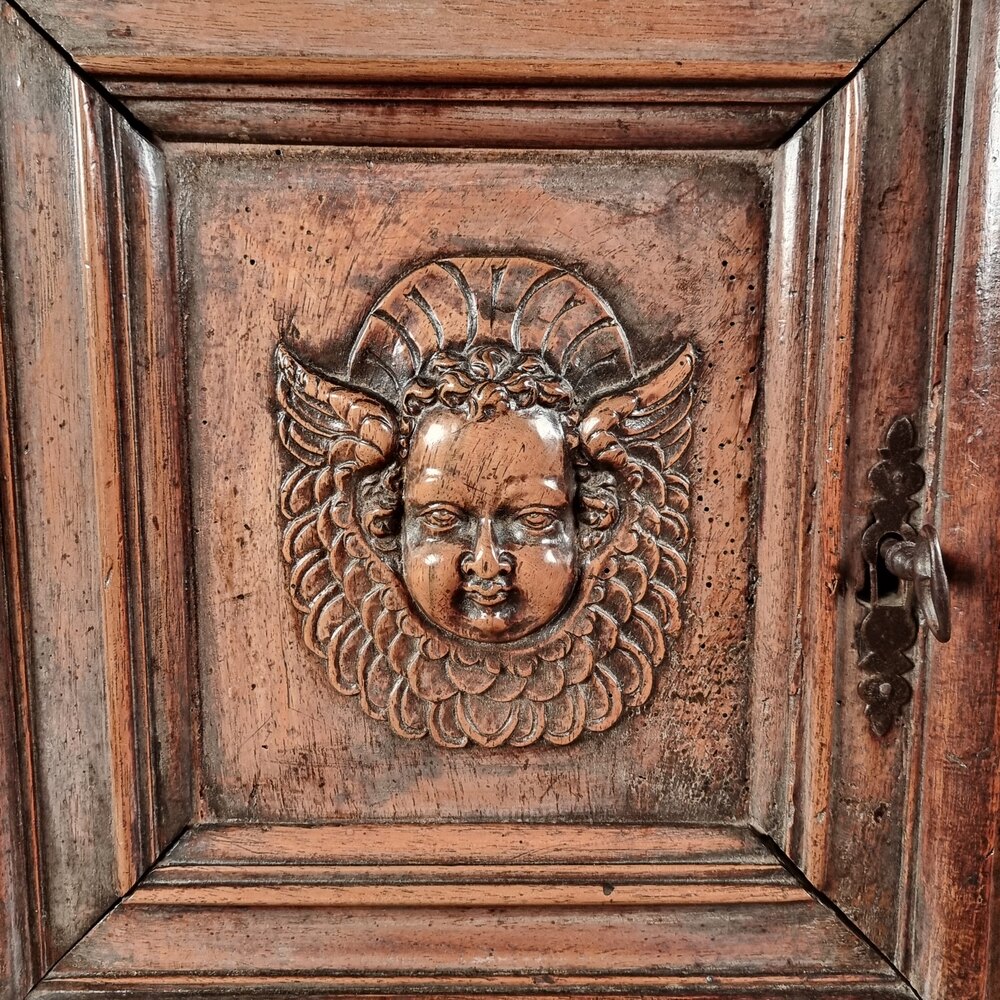 A 17th century french walnut carved cupboard, consisting of two small cupboards and a single drawer below, the pot board base also has a lidded compartment for further storage. The cupboard has a beautiful colour and patina to the surface of the walnut and is finely carved throughout. The doors are decorated with winged cherub heads, flanked by carved columns, the drawer has a deep moulded fascade which continues around the sides. The base has a pair of turned supports with a carved panel at the back decorated with another cherub head set within a scrolling foliate and elongated cartouche.There is one key which only locks the top left cupboard, the other locks are present, but unfortunately there are no keys for those.