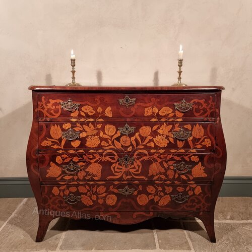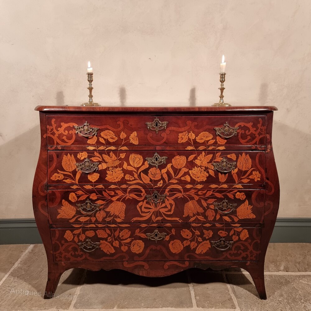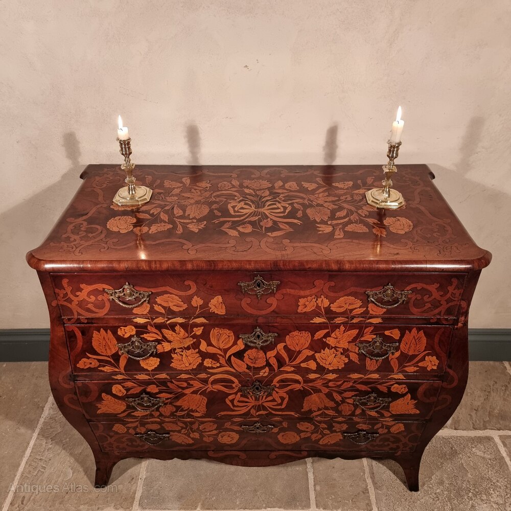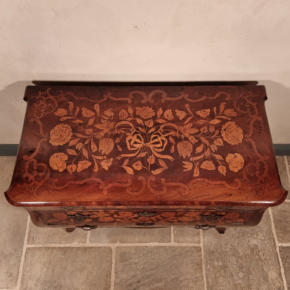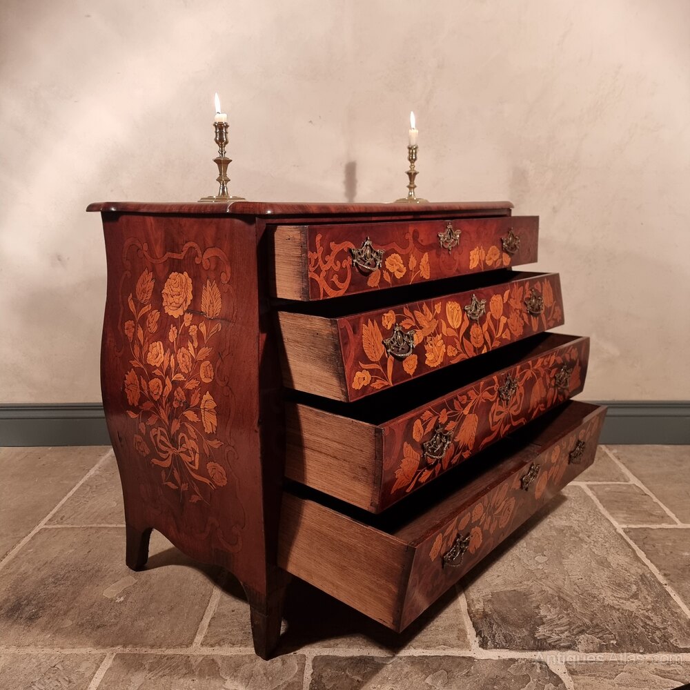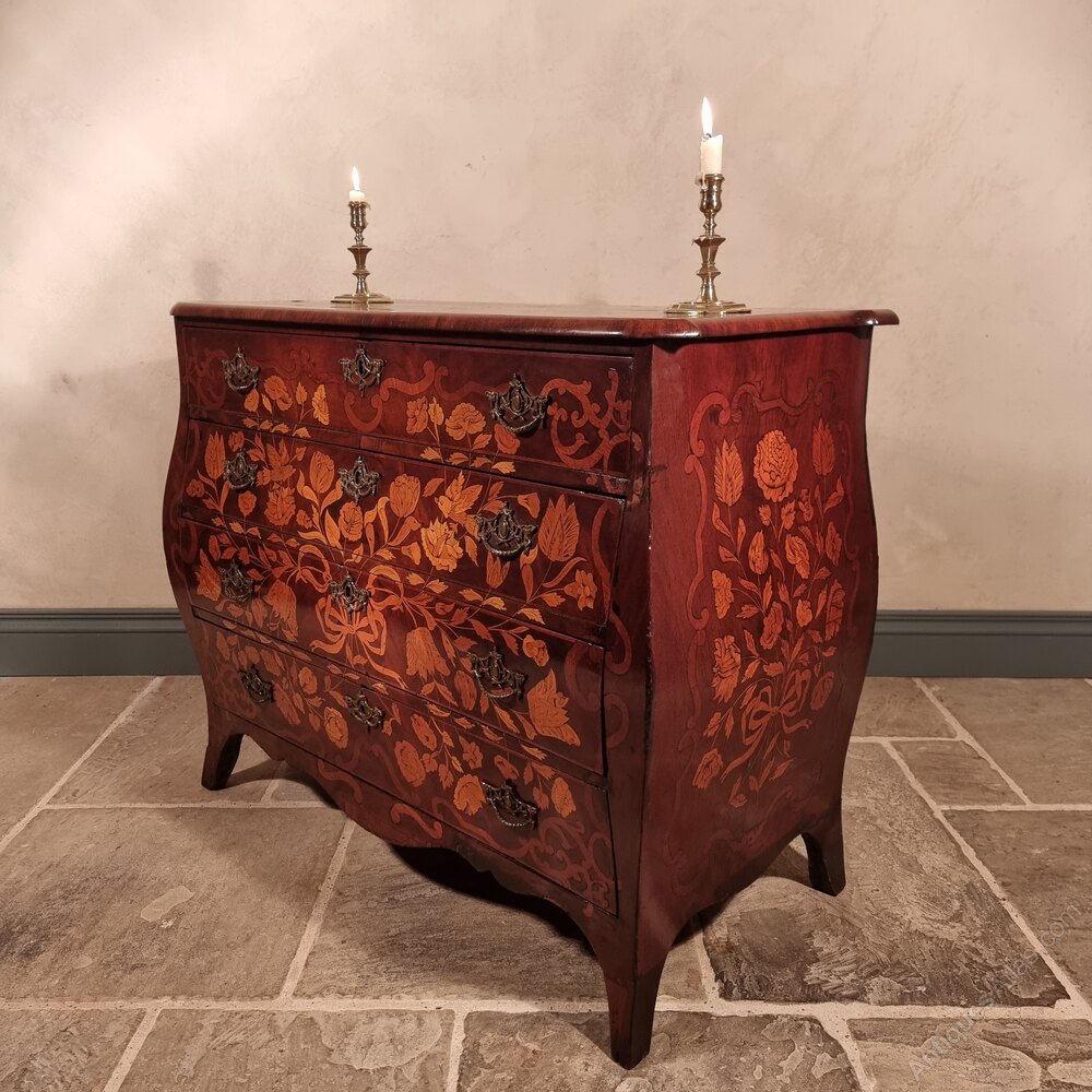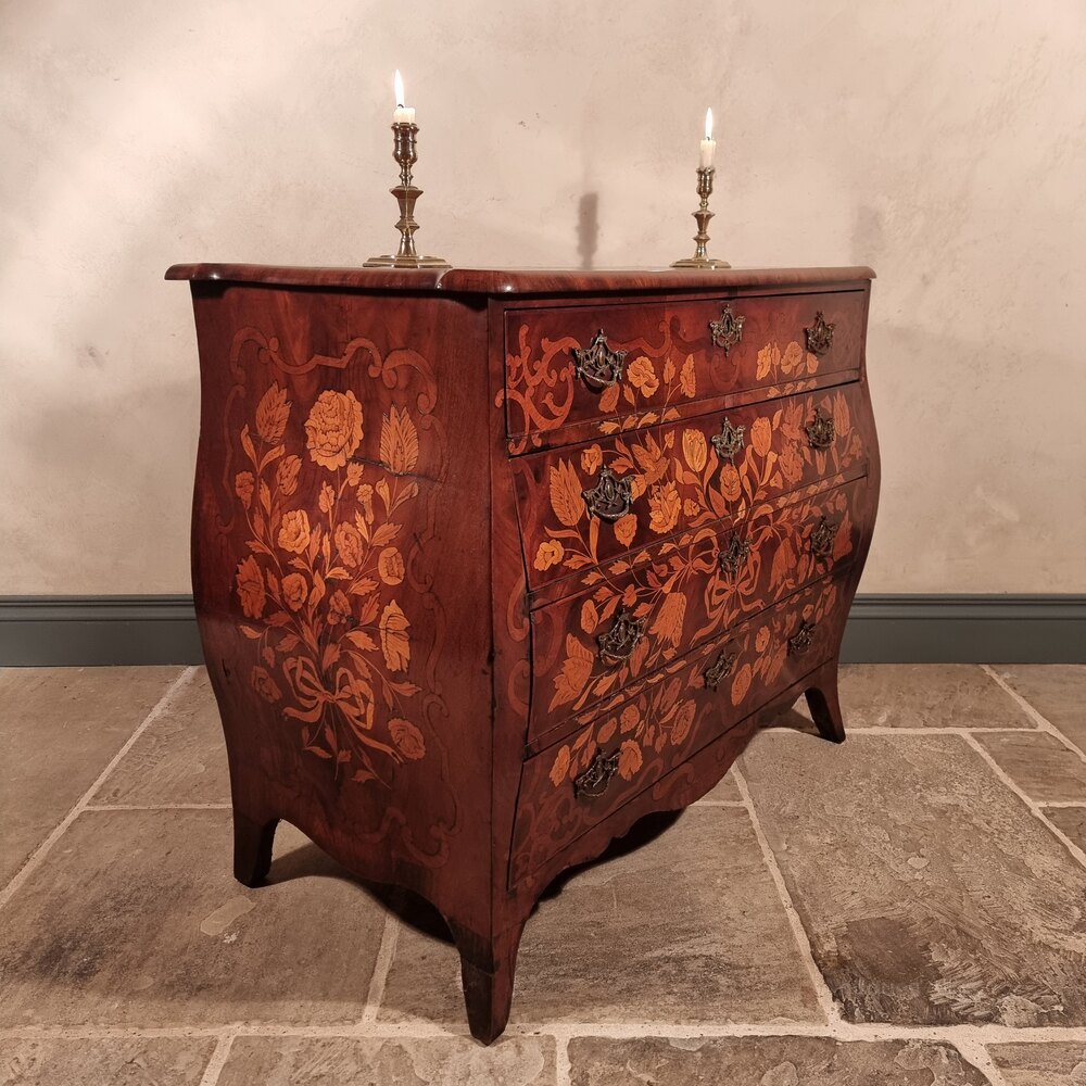 An 18th century dutch bombe marquetry chest of drawers decorated with an abundance of floral designs with brass handles and escutcheons. The chest has a fabulous patina and is in good condition with some minor losses and signs of old restorations commensurate with age.measurements