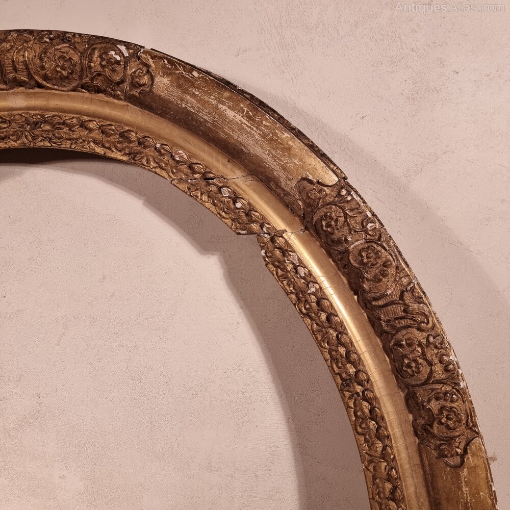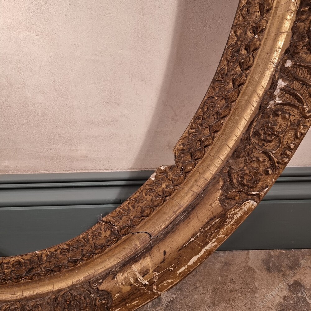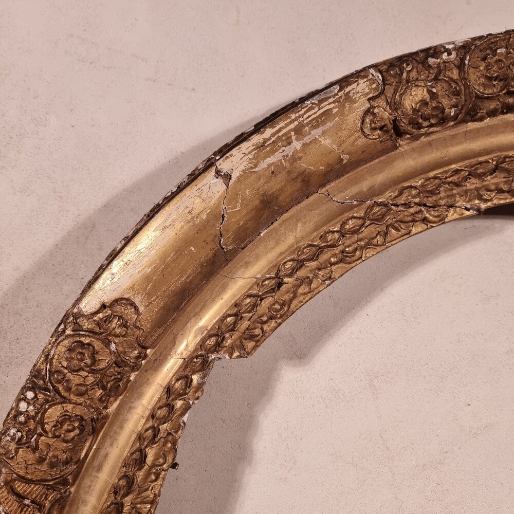 A 17th - early 18th century gilt carved oval frame of large proportions and in need od some minor restoration. There are a couple of areas of the carving missing which could easily be replaced, along with some loss to the gilding commensurate with age.Overall measurements