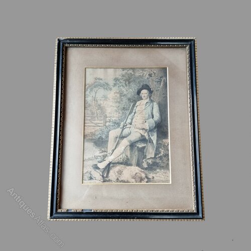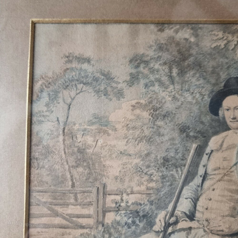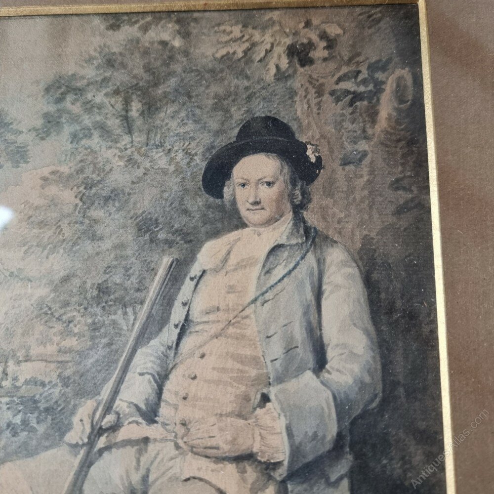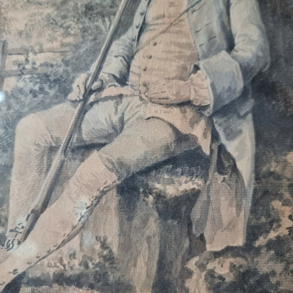 An 18th century watercolour in the manner of Francis wheatley. The picture depicts a gentleman sat with his musket and dog, in a country setting. The watercolour is house in a ebonised and gilt frame and set behind glass , the frame has some minor losses, but overall the picture seems to be in good condition for its age and is of exceptional quality.Measurements Height 37cm x width 29.5cm x depth 2.3cm
