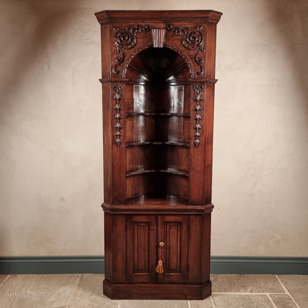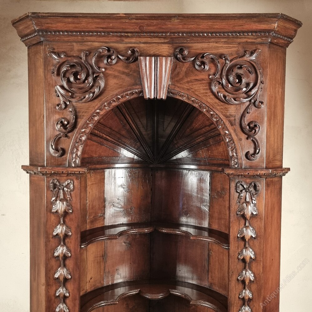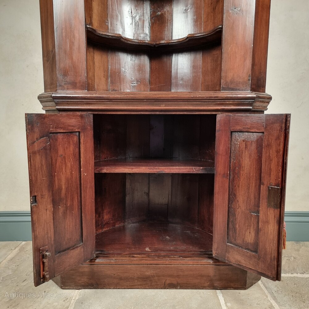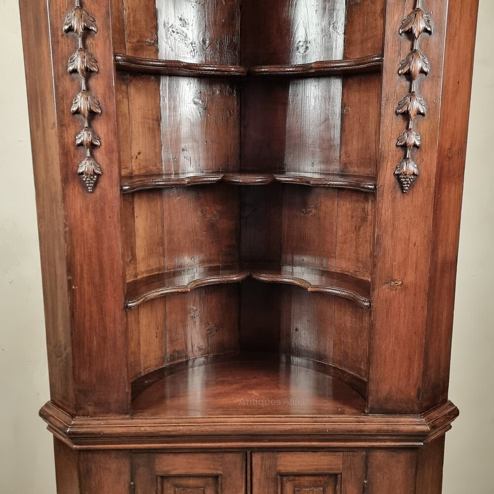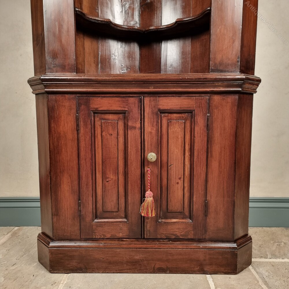 A pine Georgian style carved free standing corner cupboard with barrel back and shelved interior , the panelled cupboards having further storage and working lock and key. The cupboard has a stunning patina and has some minor losses to the decorative applied carving but overall is in very good condition.Measurements