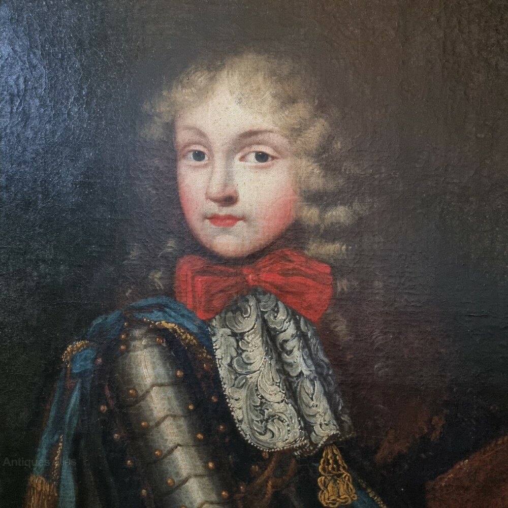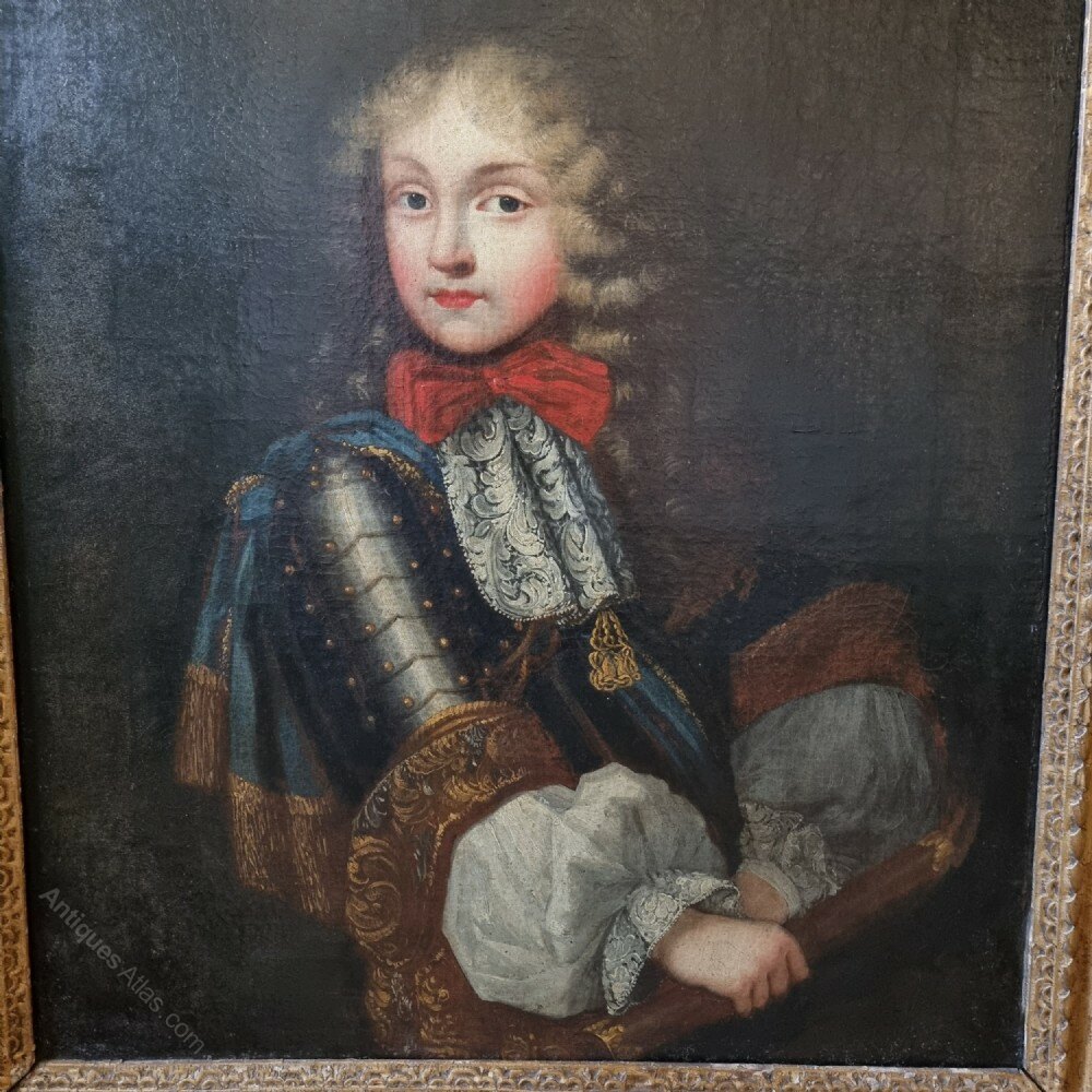A late 17th century portrait of Victor Amadeus II, Duke of Savoy C1675 - 1730 , King of Sardinia C1720-1730 , and King of Sicily C1713-1720. The portrait was most likely painted around 1675 when Victor became duke of savoy at the age of 9. The portrait is very well painted and shows the young duke dressed in his armour with his finely made garments and red bow, set within a 17th century English gilt carved lely frame.The painting has been relined a long time ago but is in good condition ,as is the frame, with some losses to the gilding.
