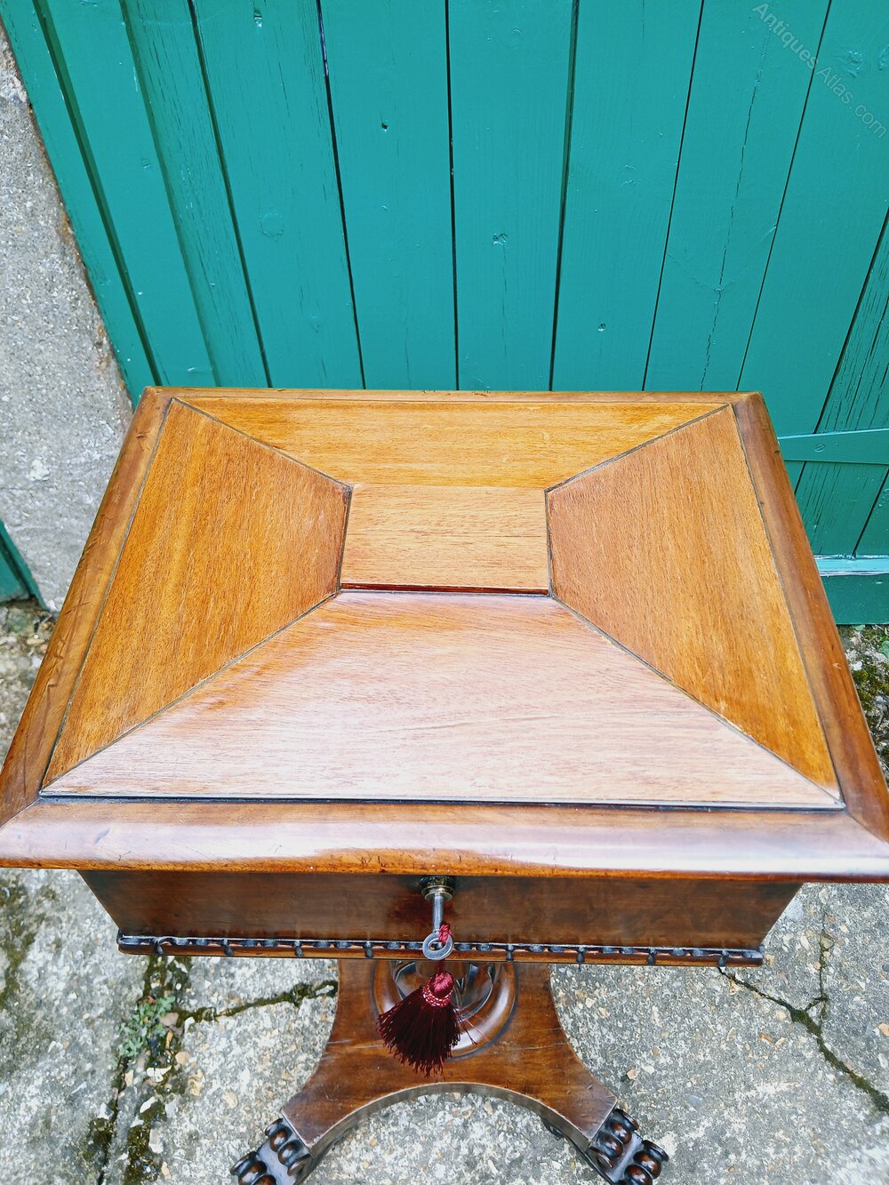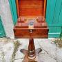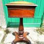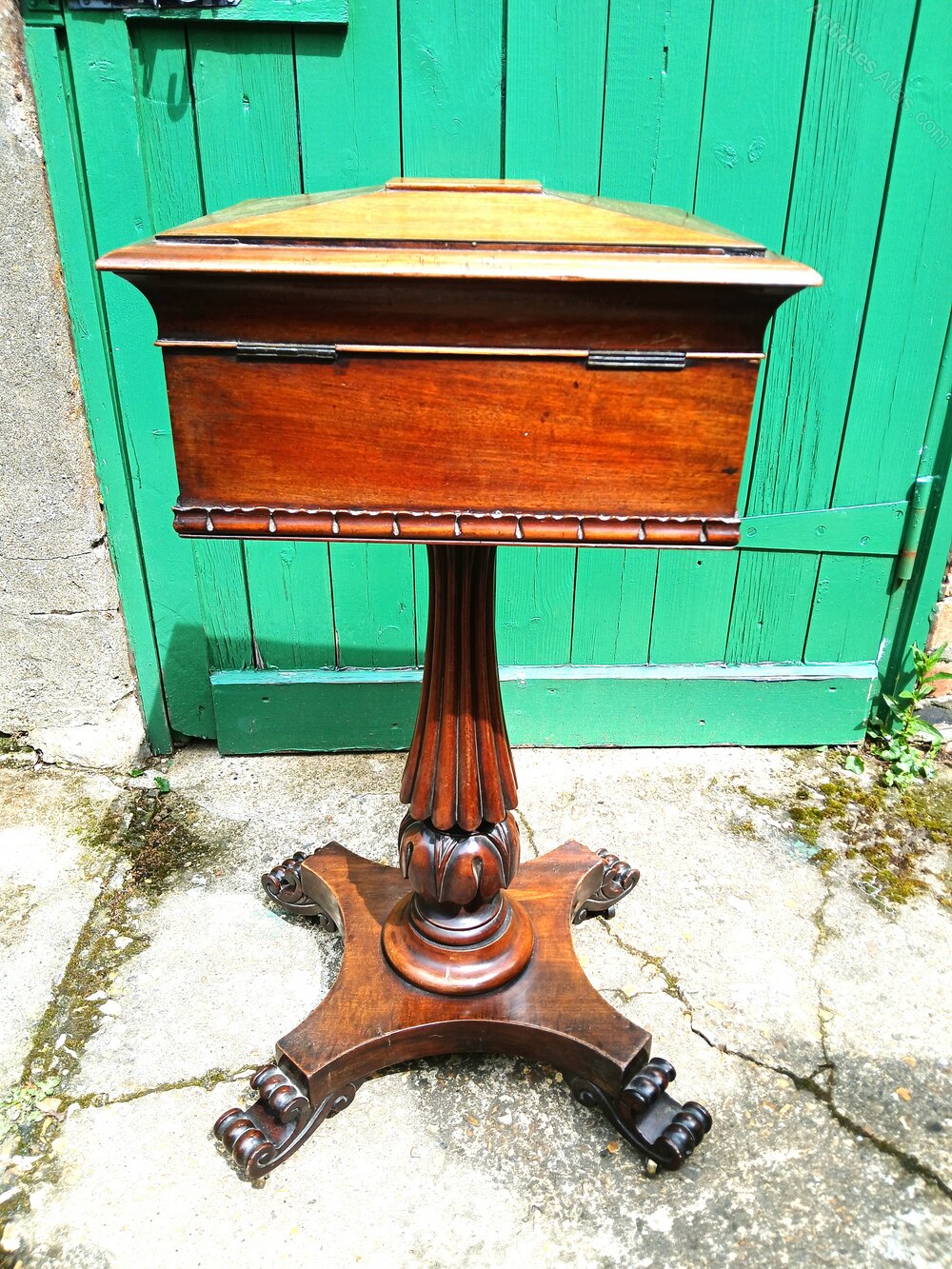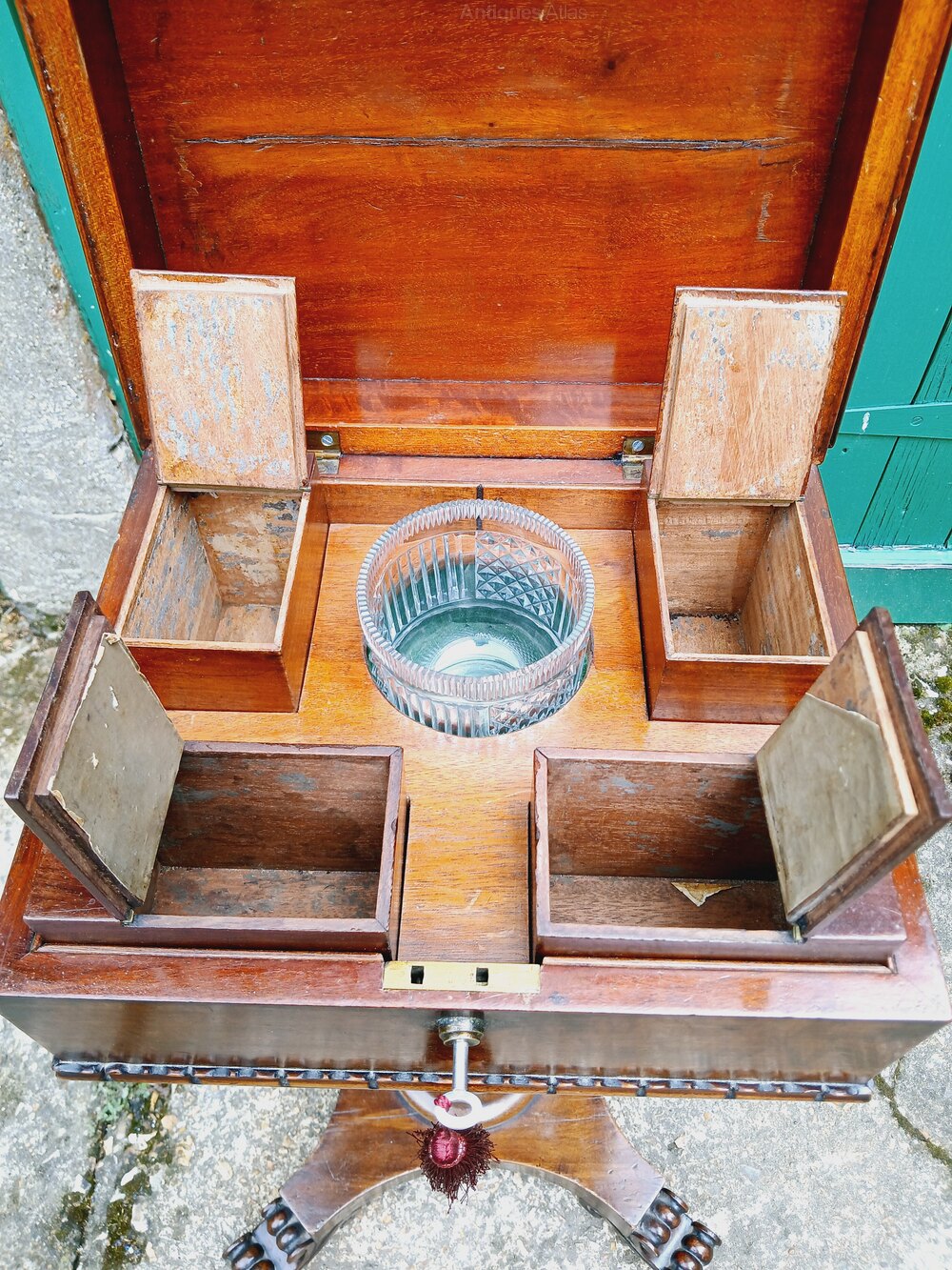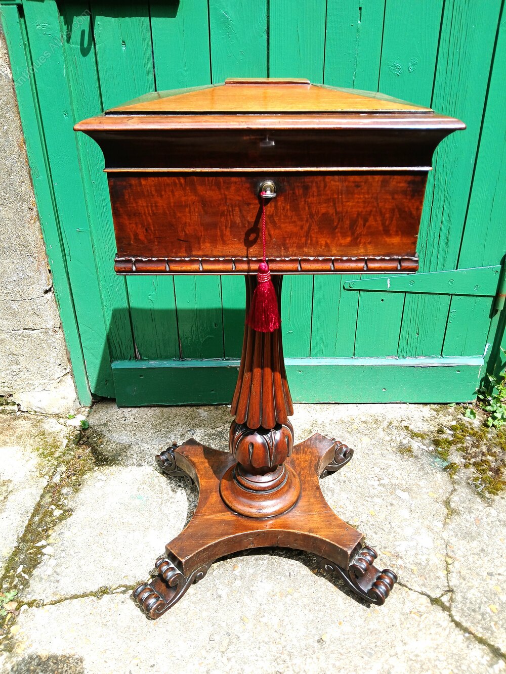 Victorian Mahogany Teapoy in very good condition. The box itself is fitted with 4 canisters and a mixing bowl complete with lock and key. All in good order. The box is mounted on a fluted centre column with carving beneath, with a 4 footed base with scroll feet and on 4 small brass casters.Height 79cms
