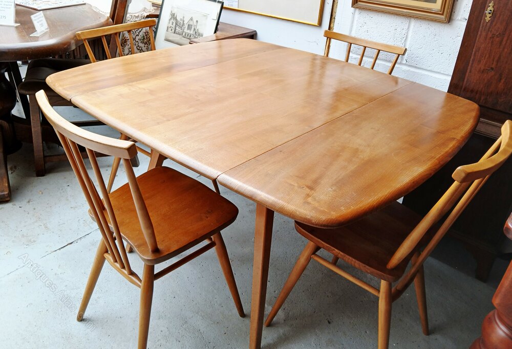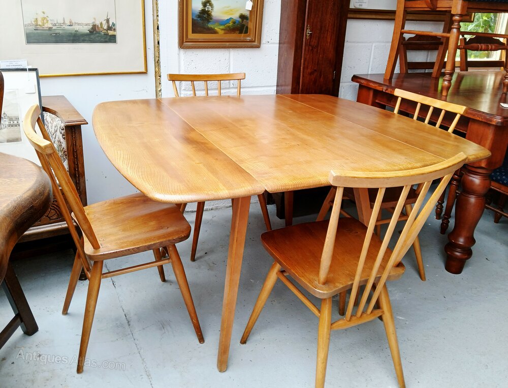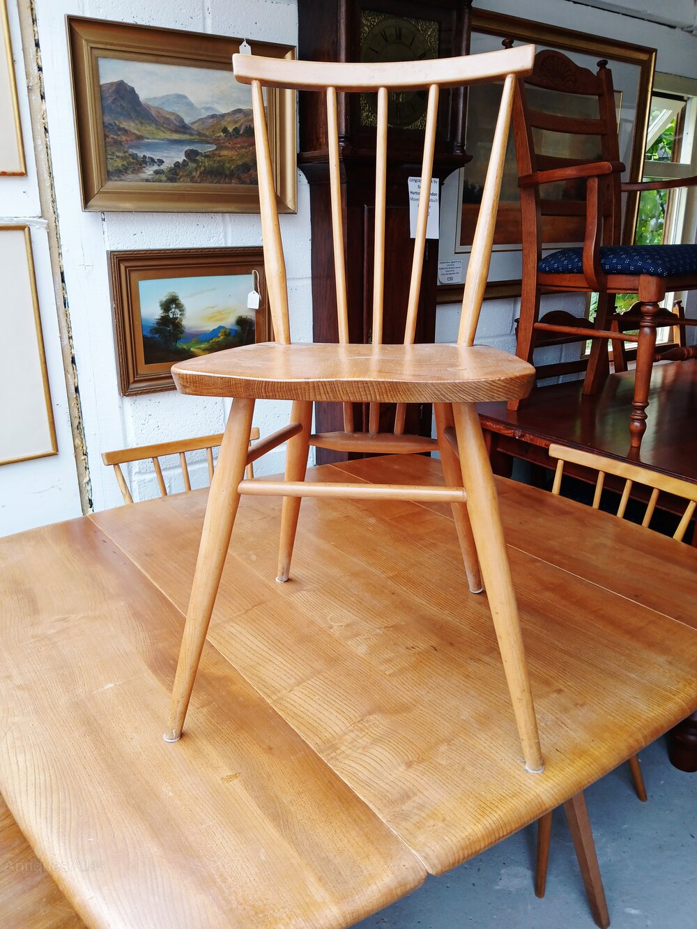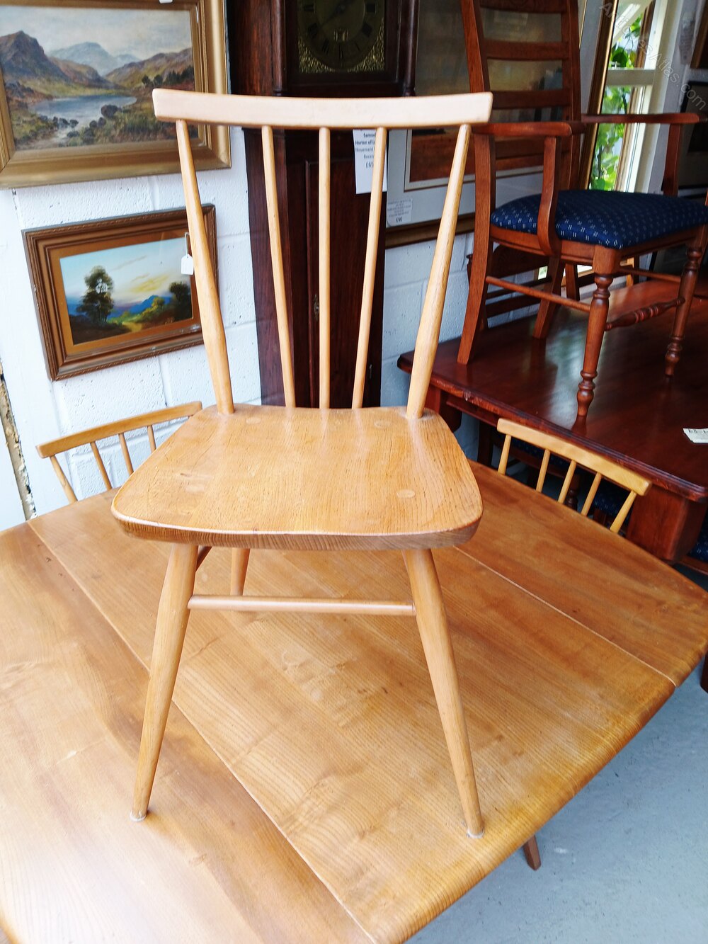 Early 1960's Blonde Ash Ercol Drop Leaf dining table and 4 Beech and Elm dining chairs Design 139 . Came from a good home, one owner form new. In excellent condition.Size of table with leaves out 44" x 49"