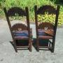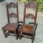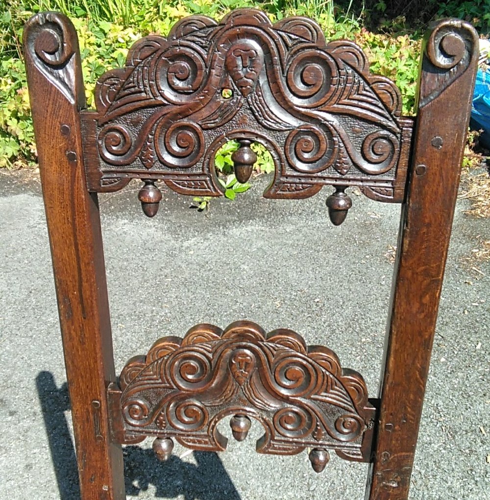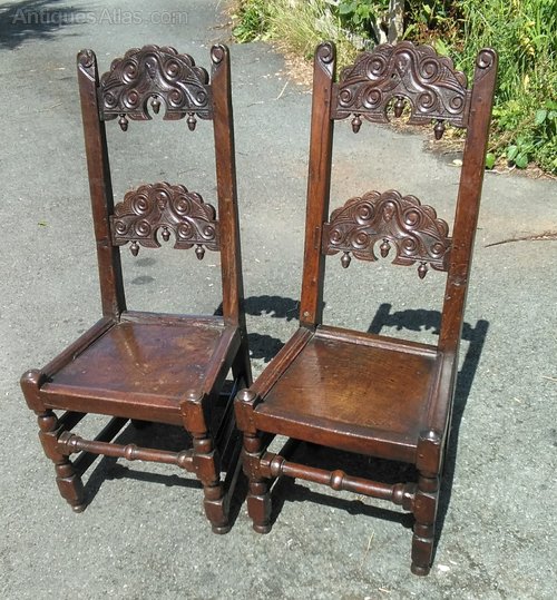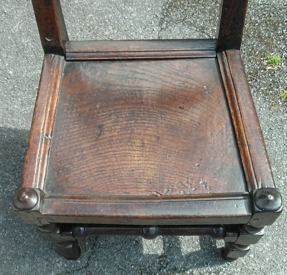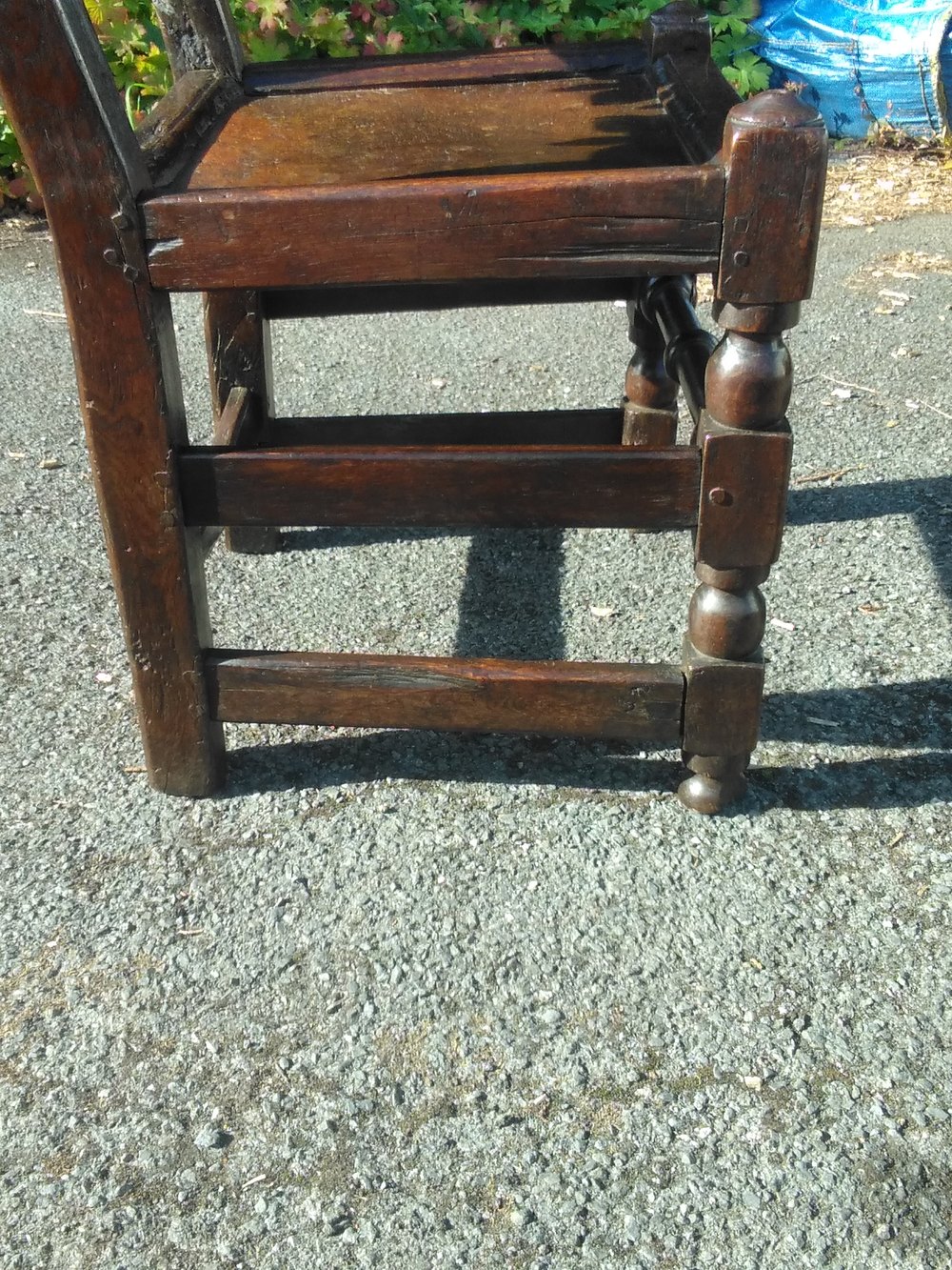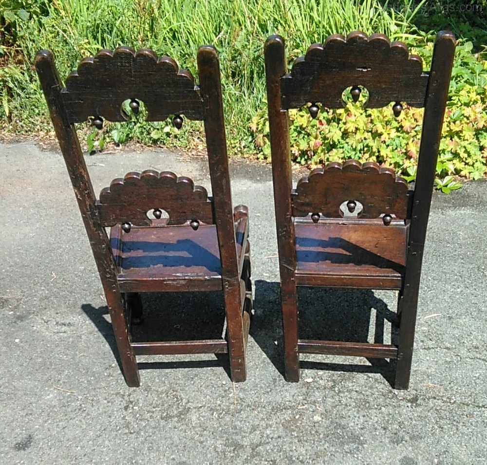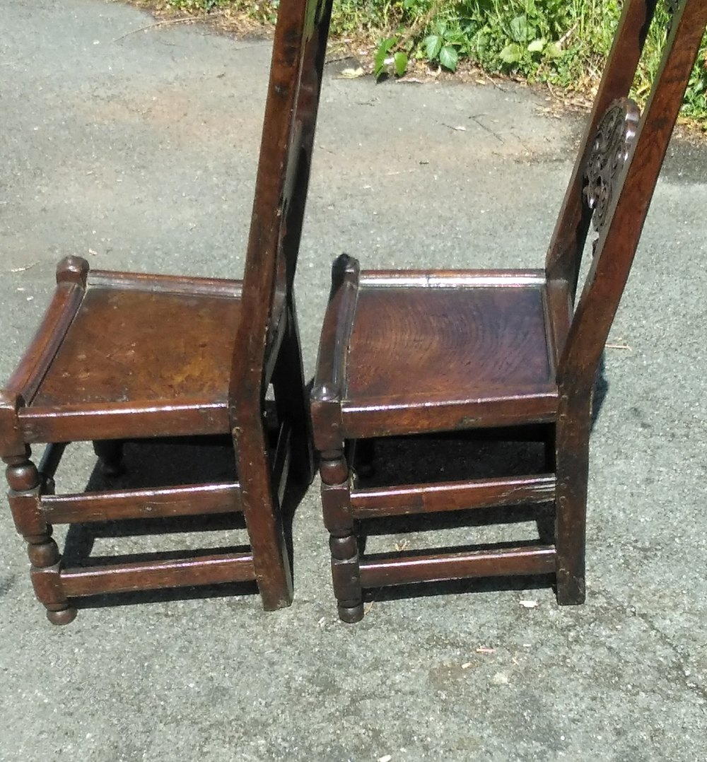 A pair of early oak Derbyshire Chairs. As you might expect close to 350 years have left the chairs with a bit of restoration over the years, one new back upright and one new spell. I say new but it's a relative term, in the picture of the one chairback the left upright is perhaps only a hundred years old from a few inches above the seat upwards. The top spell in the last picture is not quite as old but needs a little toning down to match. There is a little fore and aft movement in the chairs due to shrinkage but only to be expected in chairs that are peg jointed and have never been glued. It would be a shame to take them apart to glue up and spoil the originality. They come with two thick squab cushions to meet the needs of 12 generations growth in our height since they were made.DateRestoration :
