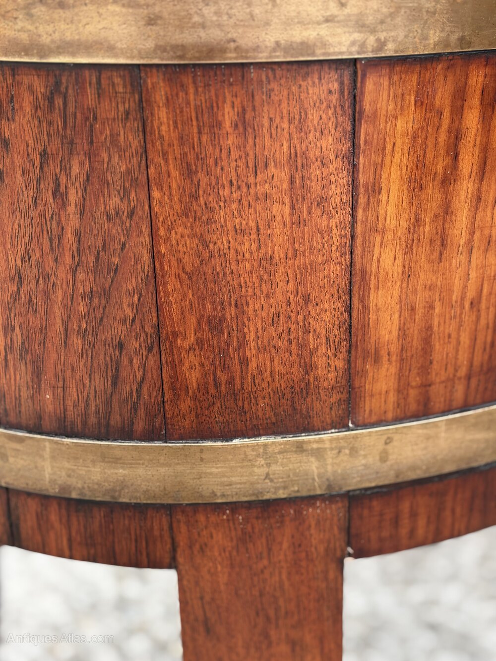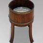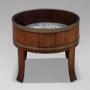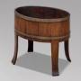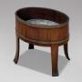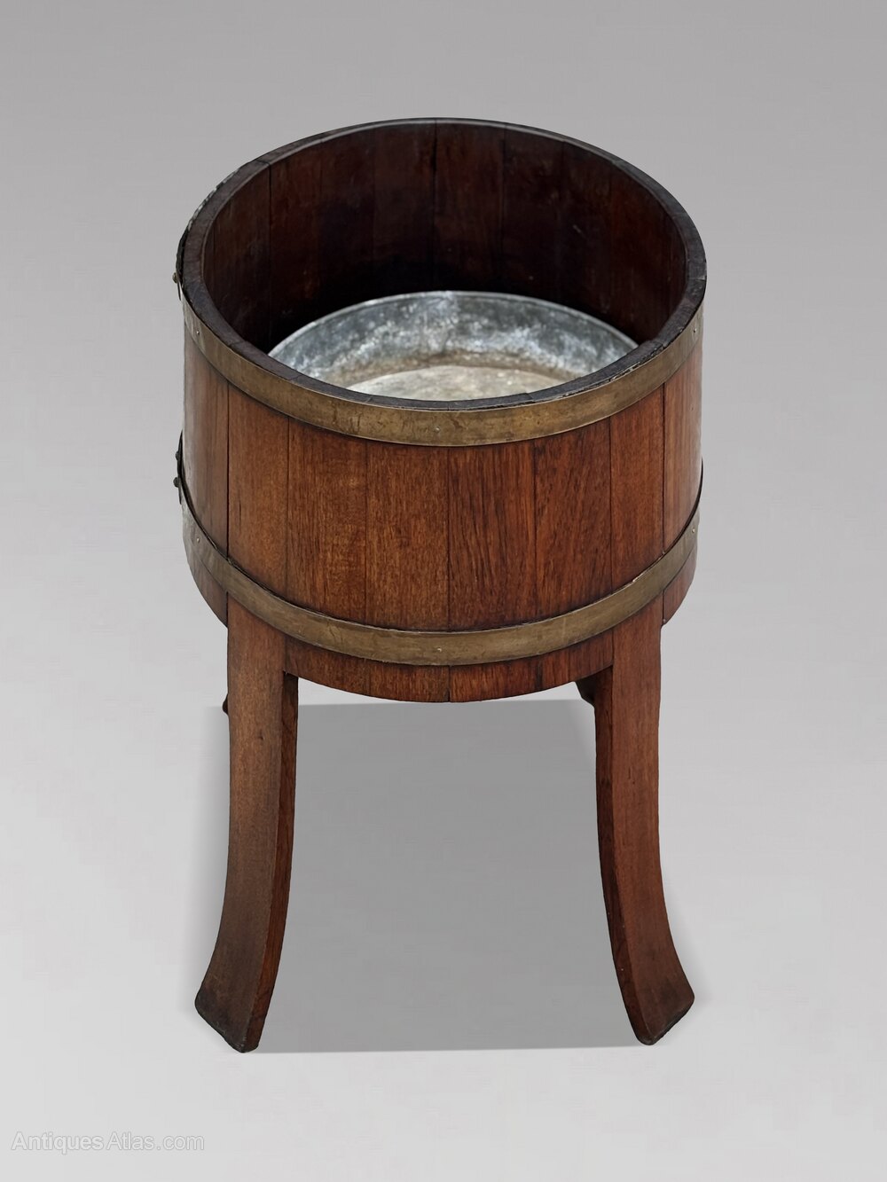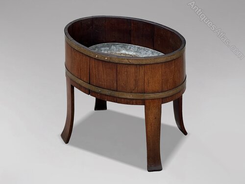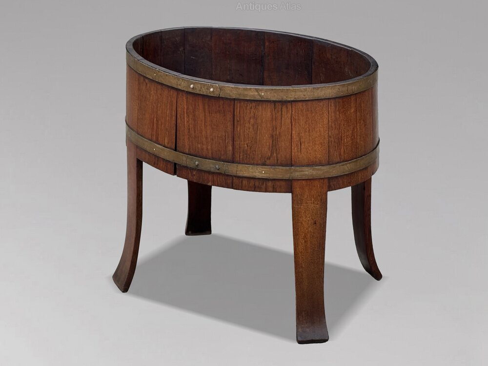 A fine Georgian Walnut Brass-Bound Oval Wine Cooler or JardinièreA fine Georgian oval wine cooler or jardinière in richly figured walnut, coopered and bound with deep brass bands. Resting on well-proportioned sabre legs, this example reflects the quiet refinement of late 18th to early 19th-century English design. Retaining its original shortened lead liner, the piece remains in untouched, all-original condition - the surface beautifully mellowed with time to a warm, mellow patina that speaks to its age and authenticity. This cooler, with its honest craftsmanship and understated design, likely originated from a country or Estate cabinetmaker, serving a grand rural household. Unlike the opulent mahogany examples produced by London workshops for the city’s elite, this piece captures the charm of regional craftsmanship - simpler in ornament, but no less accomplished in proportion and presence. Its clean lines and restrained detailing are typical of the late Georgian, early Regency period, a time when elegance was expressed through balance and form rather than flamboyance. The result is a piece that speaks softly of gentility and good taste - a functional object elevated by grace and proportion.