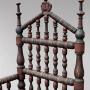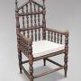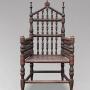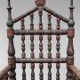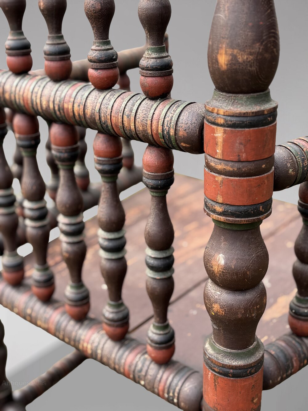 The armchair features a prominent bobbin-shaped top rail with finials and a square panel back with bobbin-shaped framing, as well as colourful turned wooden arm supports, flanked by two upright posts topped with simple finials. The base showcases beautifully turned bobbin legs united by stretchers, reflecting a high standard of craftsmanship.