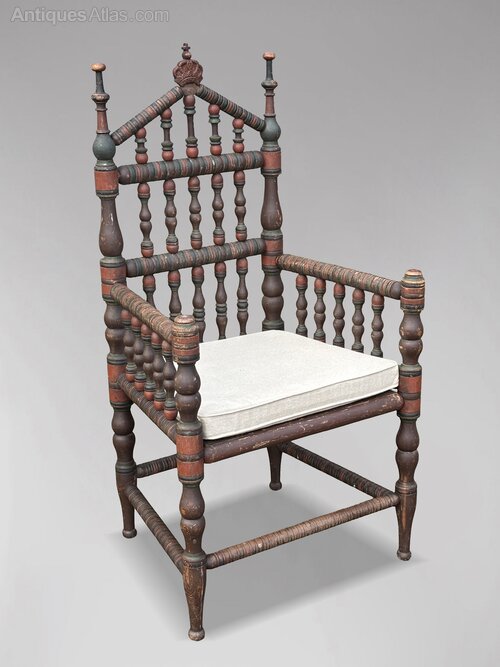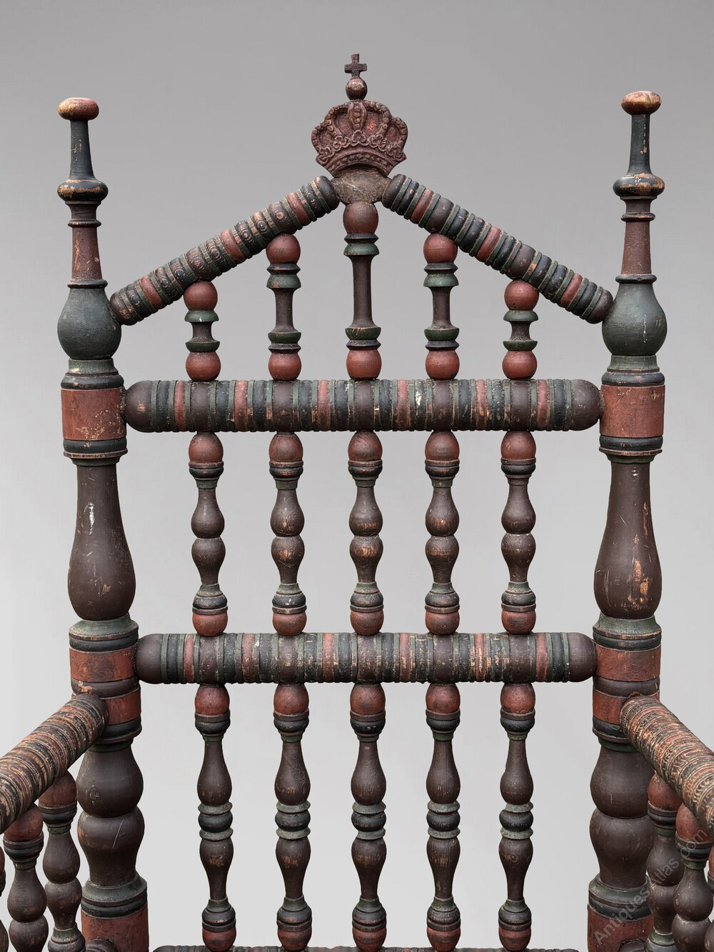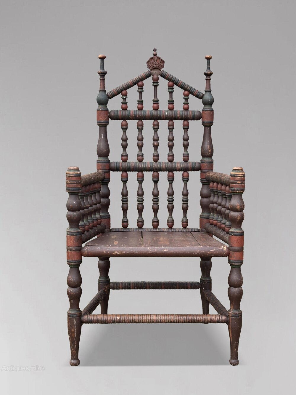 A Handsome, Colourful Scandinavian Country Throne ArmchairAn early 19th-century Scandinavian turned armchair, probably Swedish. Turned from a hard pine sometimes called Baltic redwood, this armchair retains its original paint in red, brown, green and black, and is in remarkably good condition. It is something a bit different – perfect for making a statement.