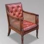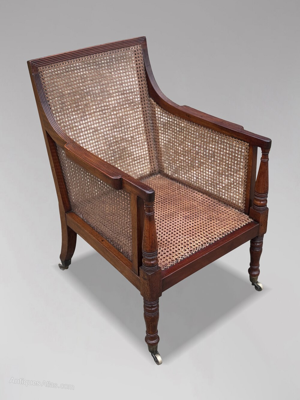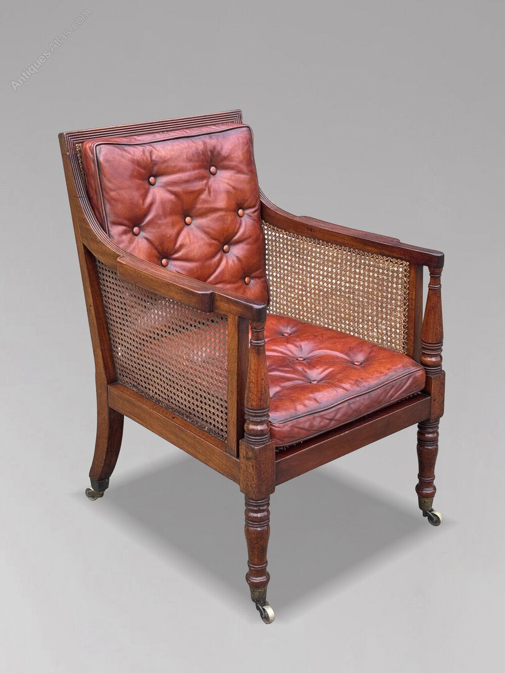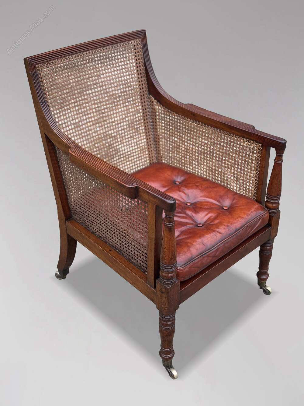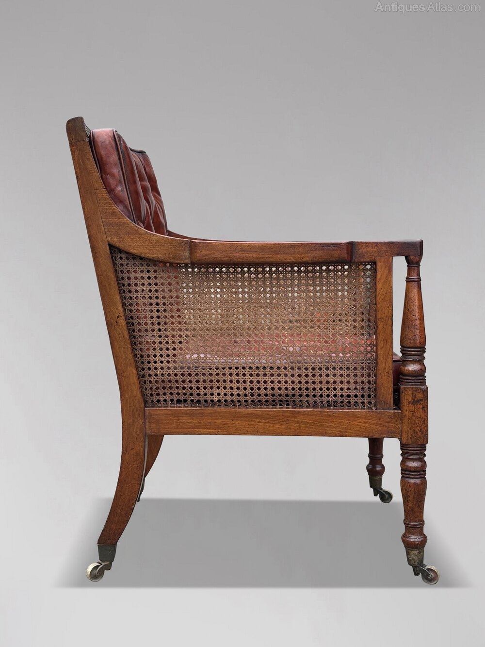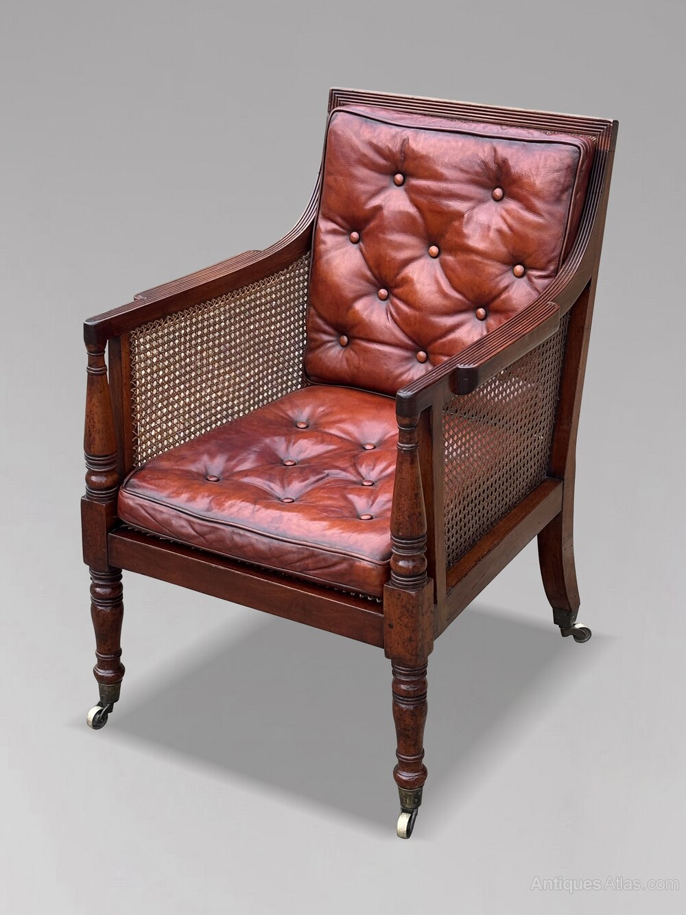 Early 19th Century Regency Period Mahogany Leather Caned Library Bergère ArmchairThis exquisite early 19th-century Regency period mahogany caned library bergère armchair is a fine example of the craftsmanship and elegance of its time. It features a beautifully caned back, arms, and seat, and is supported by elegant turned front legs and reeded arm supports, all resting on original brass castors.