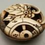 Japanese Edo Stag Antler Ryusa (Pierced) Manju Netsuke. The netsuke depicts a ox cart wheel and oak leaves, possibly symbols of a festival.Lovely condition and patina.
