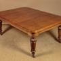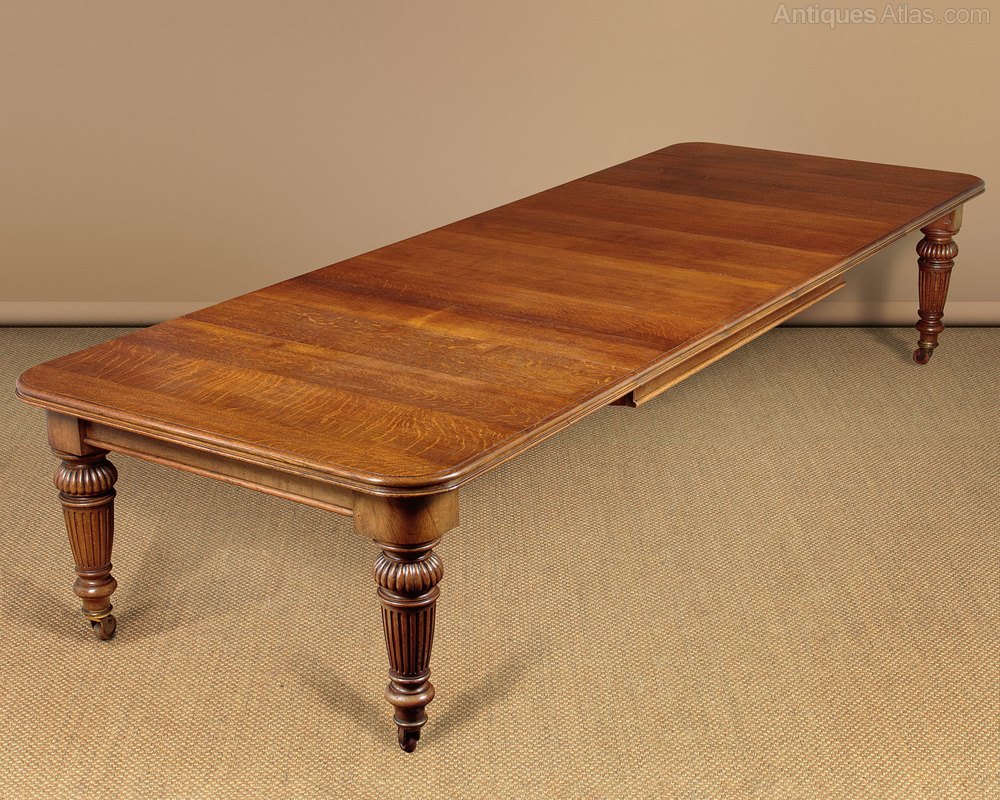 Superb quality late 19th.c. extending oak dining table c.1880. Unusually long, extending on a corkscrew mechanism and telescopic hardwood frame from 72″ to a maximum length of 144″. With four additional leaves to seat 12 or even 14 people. Solid oak top with a thumb moulded edge and rounded corners. Good turned and fluted baluster legs with the original brass collared large pot castors. Enamelled maker's labels for Thomas Edwards & Sons of Newcastle Staffordshire. Excellent colour and condition, cleaned and French polished in our workshops. Winding handle supplied.