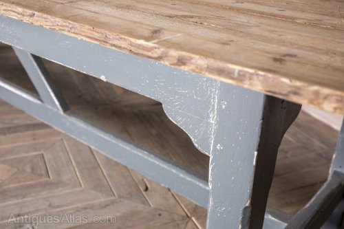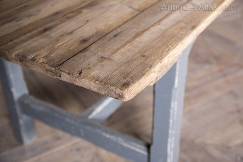 The table features an original Victorian pine top, with a reclaimed base. The base has a lovely distressed paint finish, with lots of character.