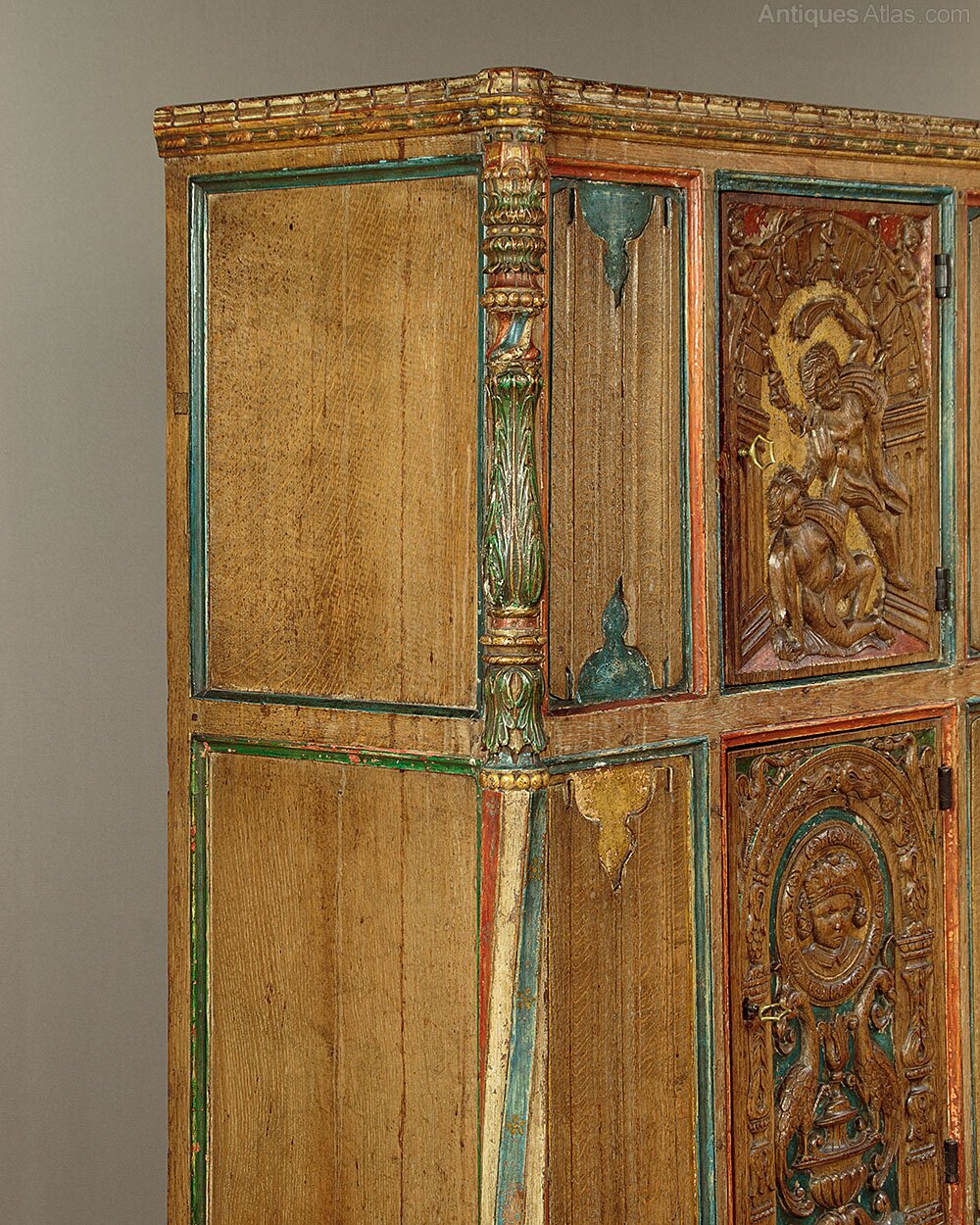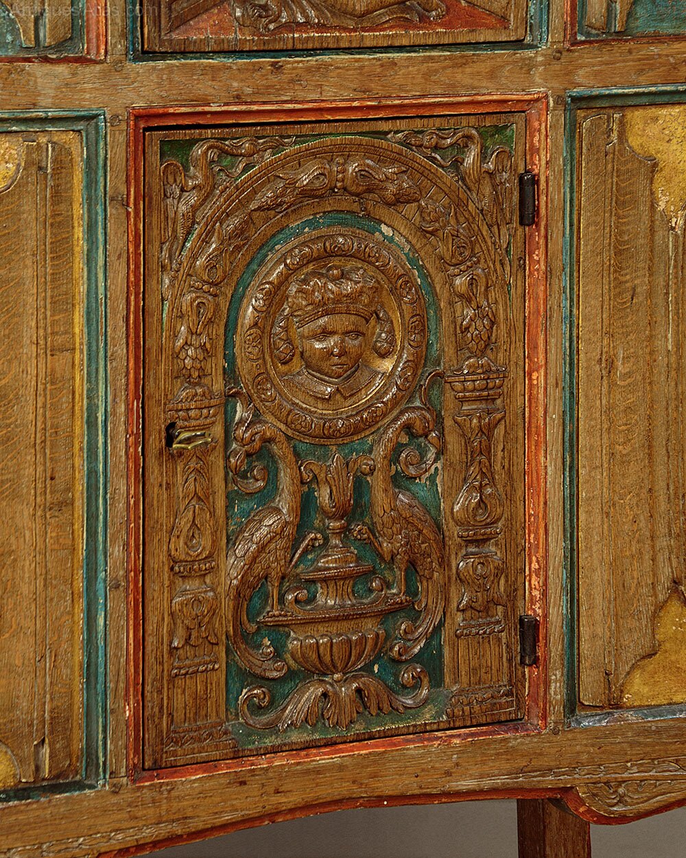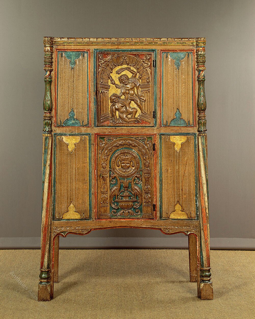 Good quality copy of a 16th.c. carved and painted oak livery cupboard. Of tapering form, 39½" wide at the base, tapering to 36" at the top. Single door cupboards top and bottom, internal depth 14". Superb Renaissance style carving to both doors, featuring Classical motifs against a painted and gilded ground. Flanked with linenfold panels and beautifully carved pilasters to the front with very attractive painted detail. Further carved detail around the top and to the apron, with Tudor or flattened arches at the sides. Oak side panels and back panels. Steel strap hinges and brass locks stamped English made. Excellent condition, cleaned and waxed in our workshops.
