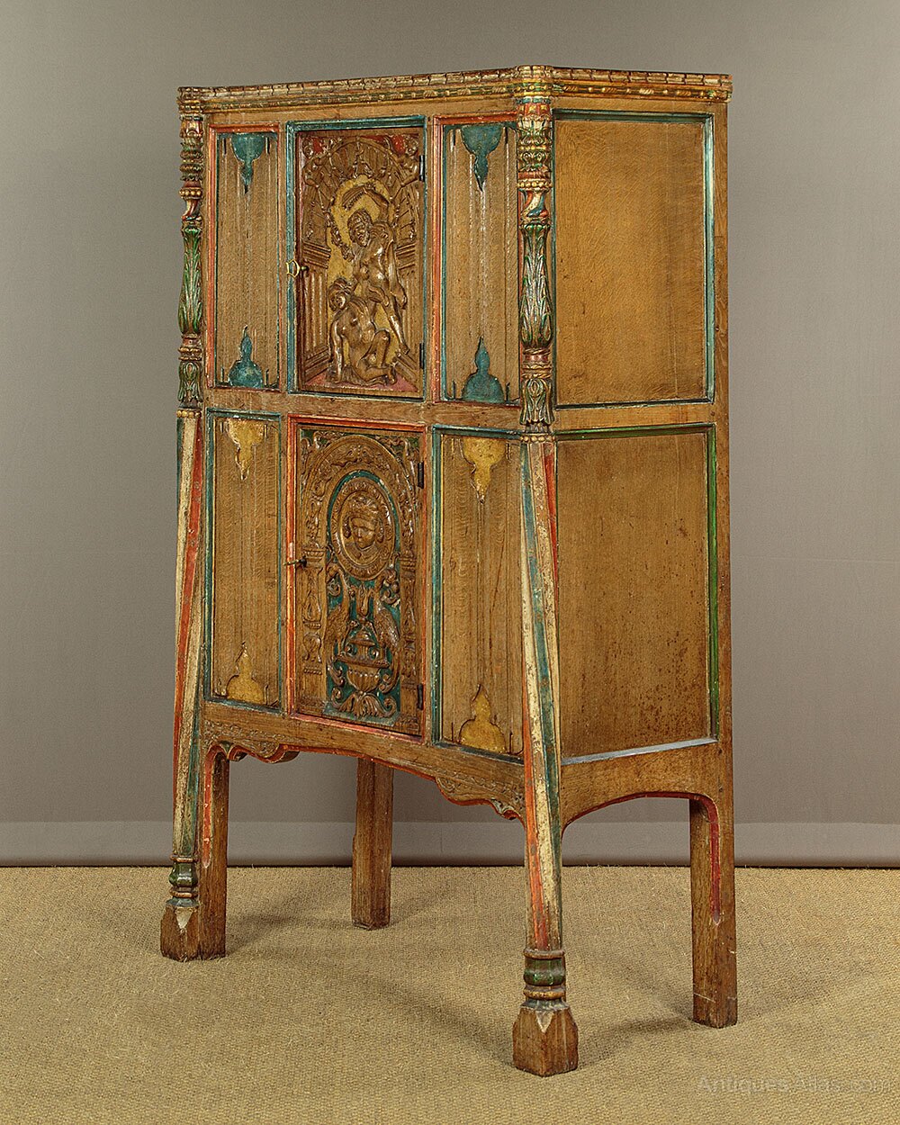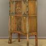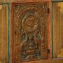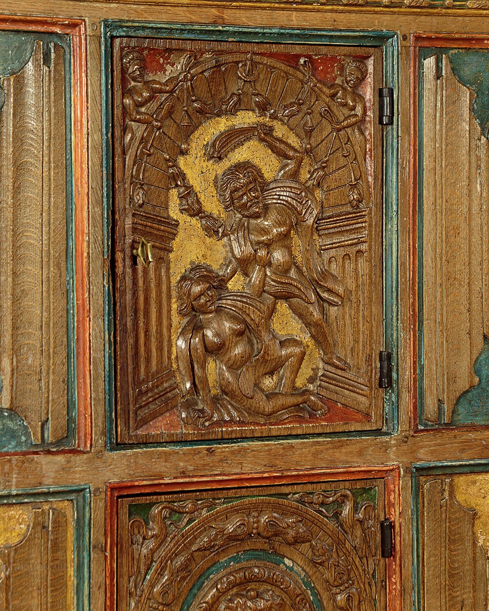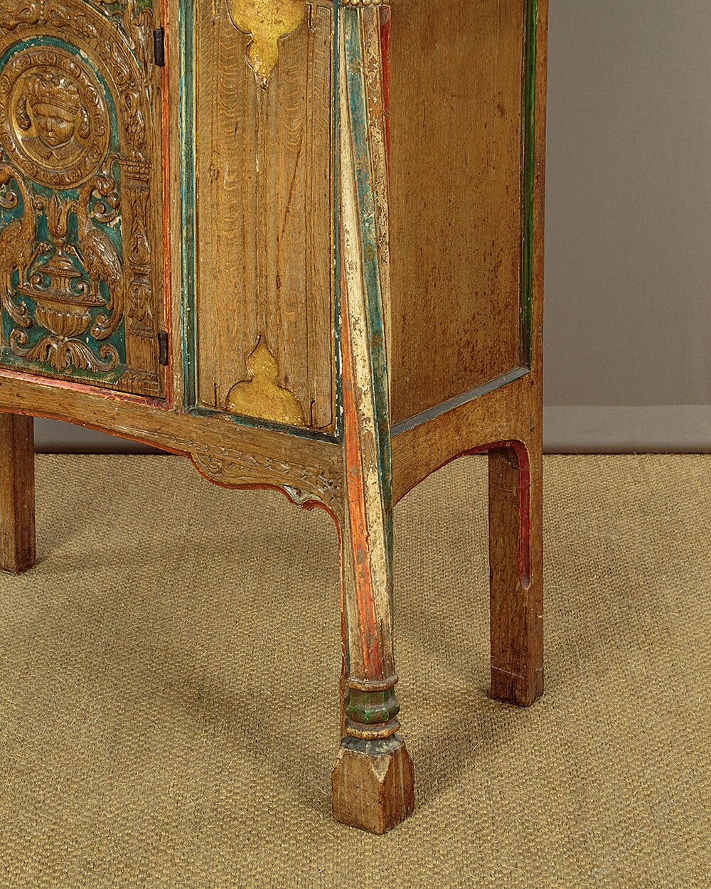 Good quality copy of a 16th.c. carved and painted oak livery cupboard. Of tapering form, 39½" wide at the base, tapering to 36" at the top. Single door cupboards top and bottom, internal depth 14". Superb Renaissance style carving to both doors, featuring Classical motifs against a painted and gilded ground. Flanked with linenfold panels and beautifully carved pilasters to the front with very attractive painted detail. Further carved detail around the top and to the apron, with Tudor or flattened arches at the sides. Oak side panels and back panels. Steel strap hinges and brass locks stamped English made. Excellent condition, cleaned and waxed in our workshops.