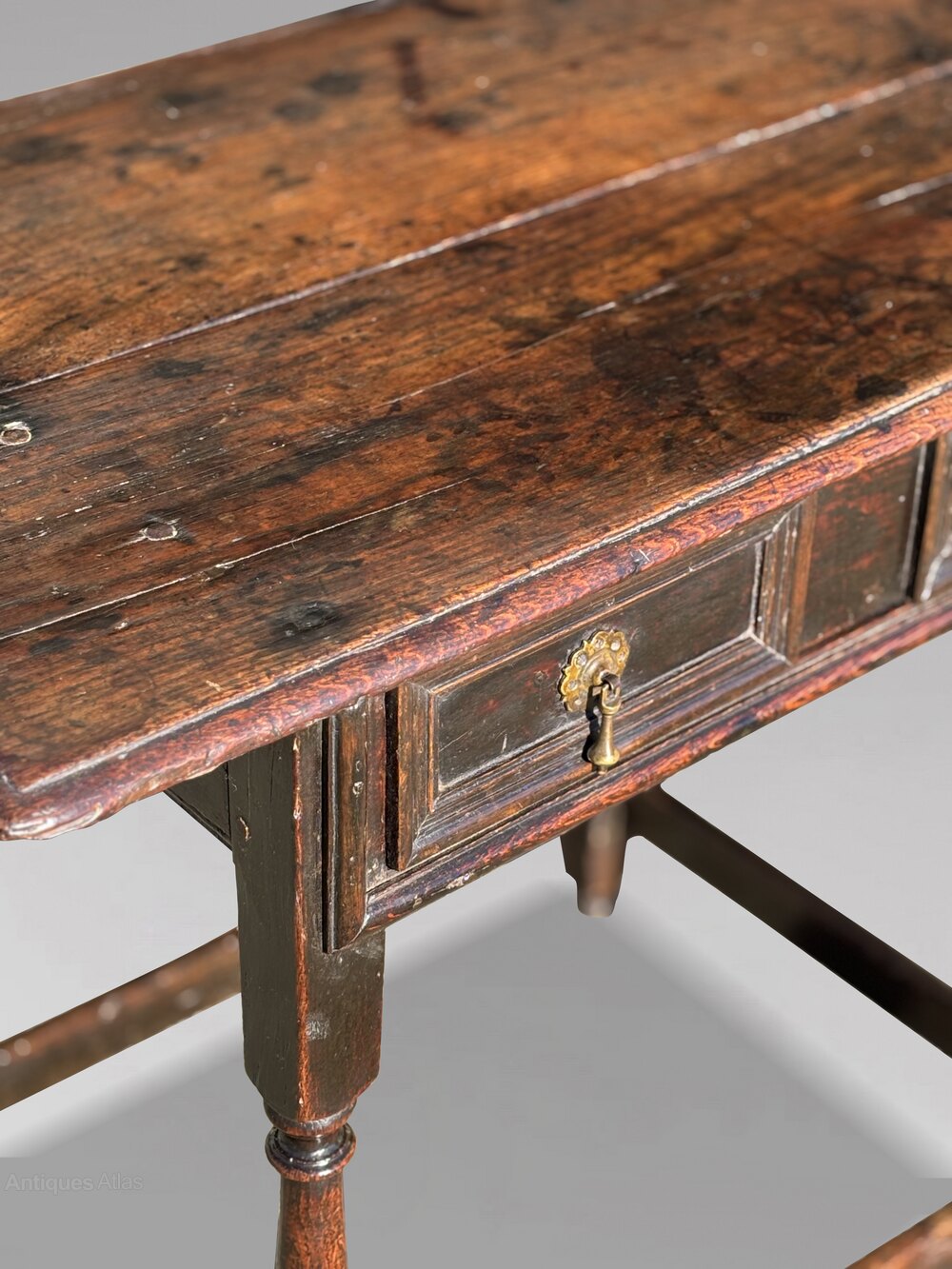 A delightful late 17th-century oak lowboy side table, circa 1680, of small, elegant proportions and with a superb rich colour and patina. The table features a solid two plank oak top with beautiful grain with a generous overhang and depth of tone, above a single moulded working drawer. The drawer front is fitted with original period solid carved brass drop handles. Standing on finely turned bulbous legs, united by the original stretchers and terminating in turned feet, this piece retains its original top, rear backboard, legs and stretchers. The frame is traditionally made using mortise and tenon joints secured with pegs, as you would expect of the period. The oak has developed a wonderfully warm, mellow surface from over three centuries of careful use and polishing, giving the table real depth of character. Solid, stable and ready to use, it is ideal as a side table in a hallway, beside a chair or sofa as a lamp table, or as an accent piece in a bedroom or study. Made in England circa 1680, this is a highly decorative yet practical example of early oak furniture, equally at home in a period setting or as a striking contrast in a contemporary interior, a true collector’s piece with charm and presence.