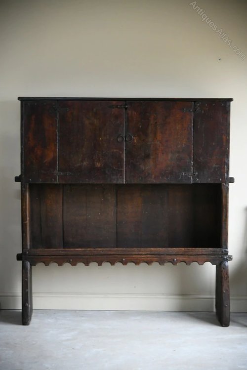 17th Century & later Oak Boarded Cupboard. Antique English vernacular oak cupboard, The cupboard enclosed by a pair of doors with combined hasp and iron loop hinges, the interior with a shelf and a later lining, below is an undertier with a boarded back and arcaded apron, the solid sides with wedged mortise and tenon joints.