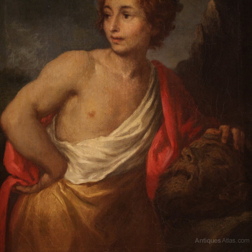 Italian school painting from the second half of the 17th century. Oil on canvas artwork depicting David, the biblical hero, captured in the moment of triumph with the head of Goliath. The story goes that a young shepherd, inexperienced with weapons, managed to defeat the giant warrior Goliath with a stone thrown from his sling.