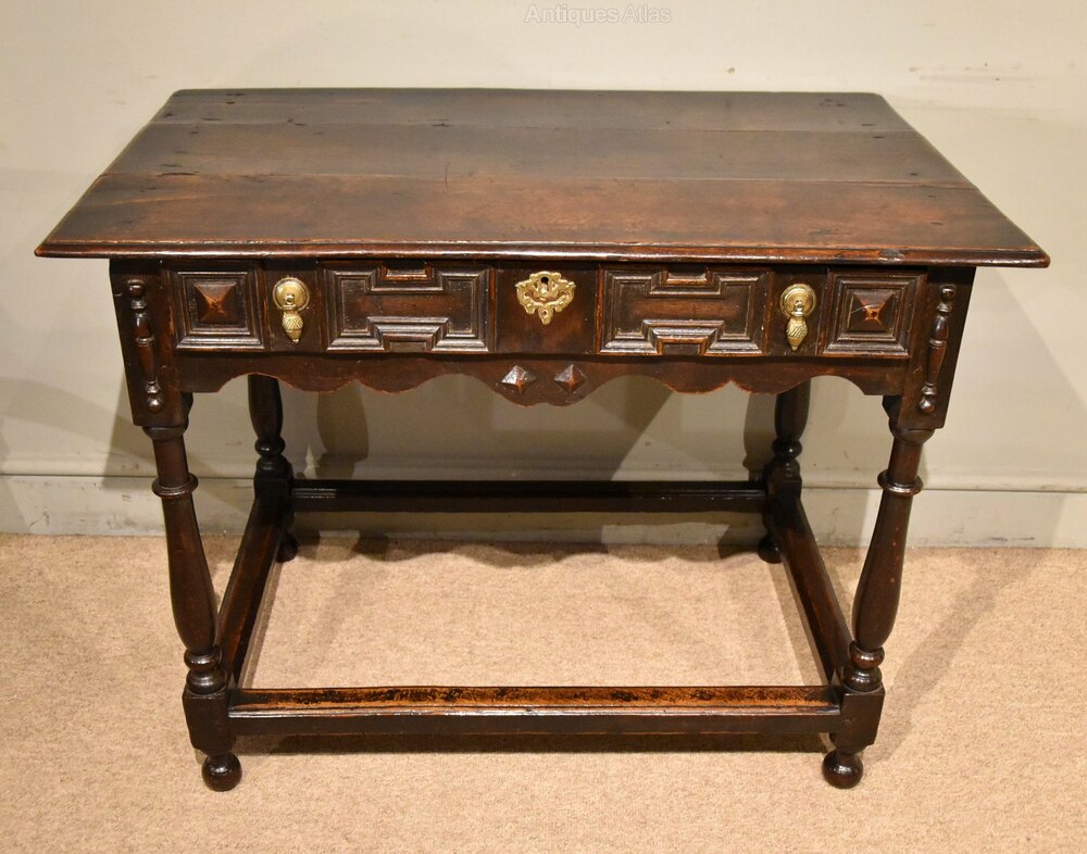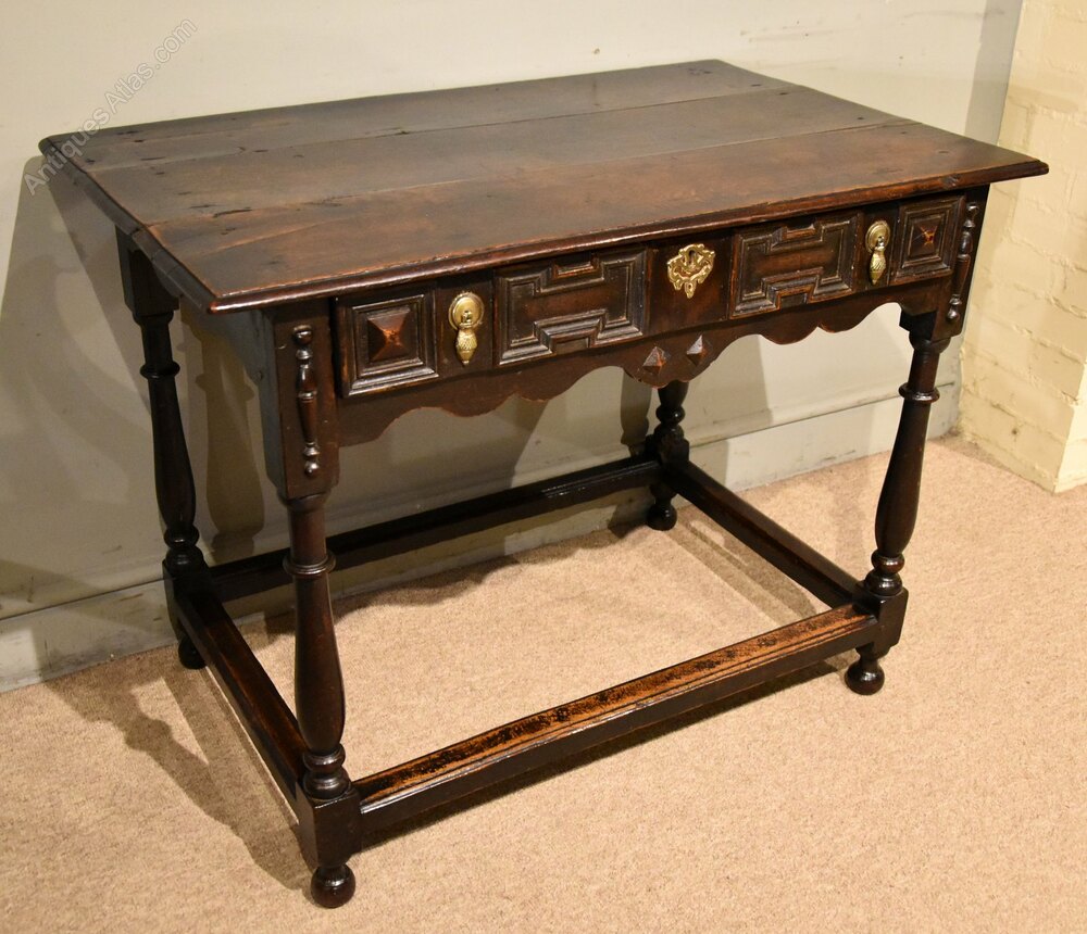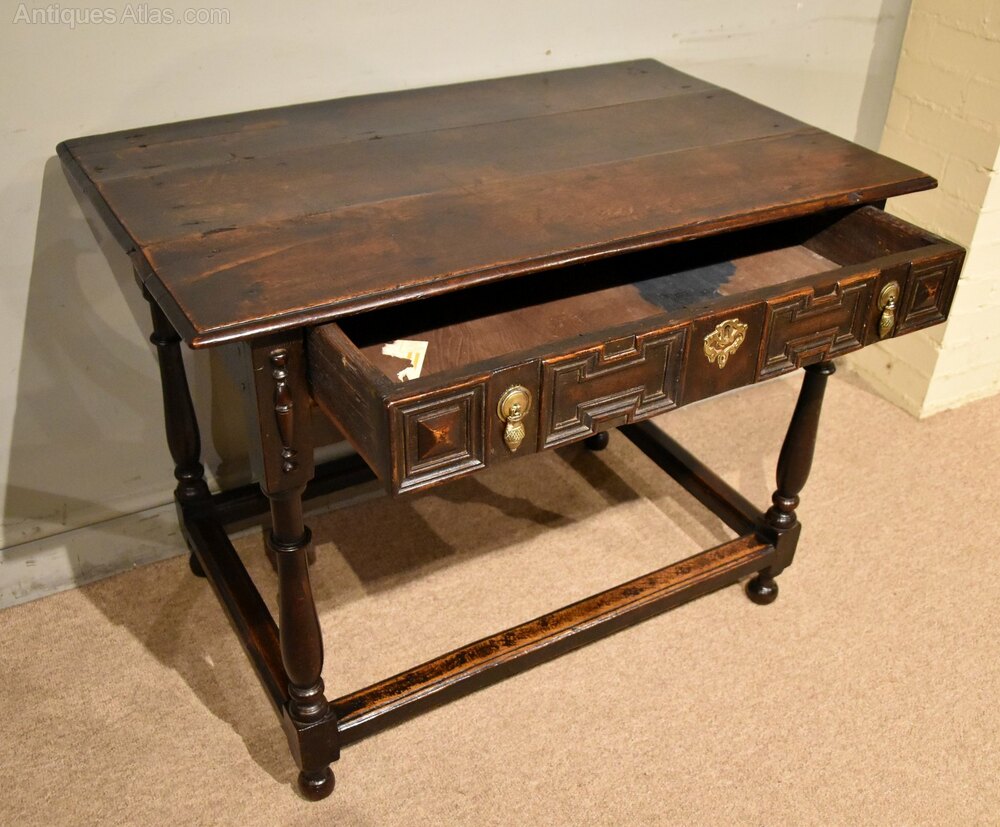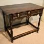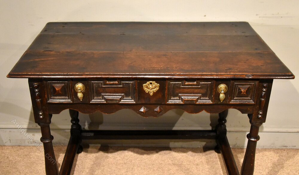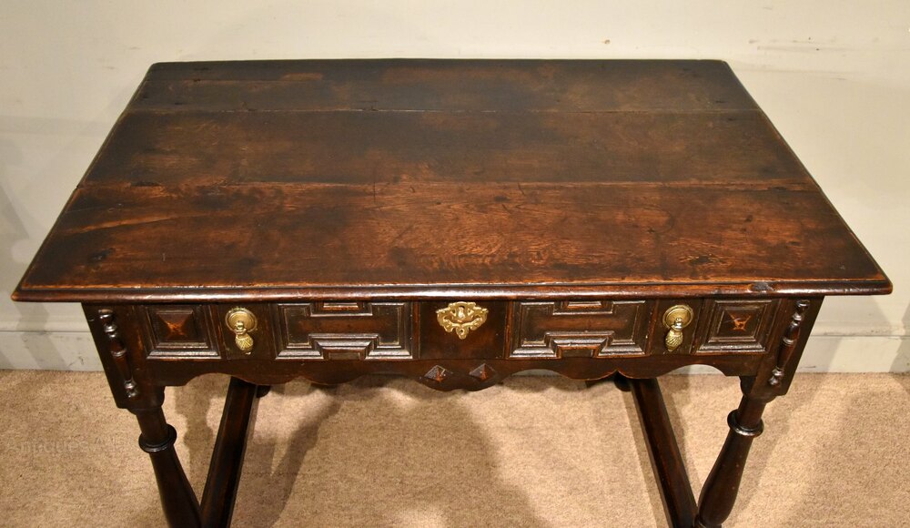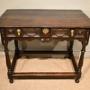 A late 17th century oak single drawer side table. The beautifully patinated top above a geometric drawer front raised upon elegant turned legs with original handles. Restorations to the drawer linings