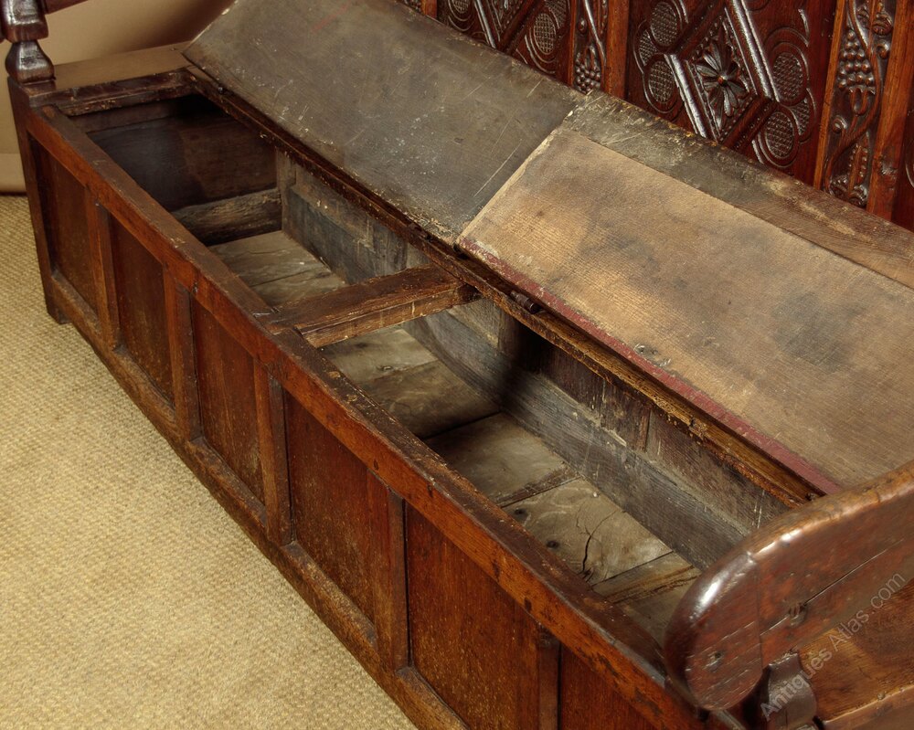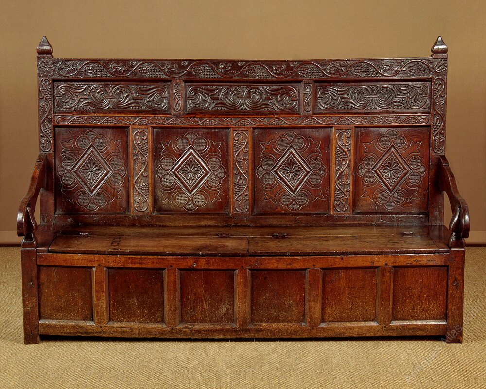 Fabulous late 17th.c. carved oak box settle c.1690. Over six feet in length. High panelled backrest topped with pointed finials and carved with a dense grape and vine pattern. The carving to the top rail, the stiles and the row of slim panels across the top is original, whilst the carving on the vertical mullions and the larger panels probably dates from the 19th.c. Large shaped arms with supports shaped as a repeat of the finials. Board seat with two hinged sections lifting to reveal plenty of storage below for shoes and boots etc. Handmade iron hinges. Six flat panels across the front below the seat between chamfered mullions. Panelled sides and rear, oak floorboards. Excellent condition and particularly good colour and patina. Cleaned and waxed in our workshops.
