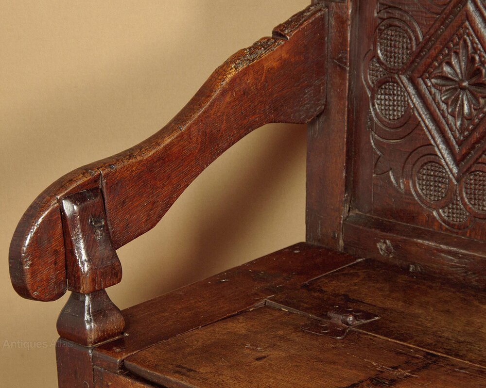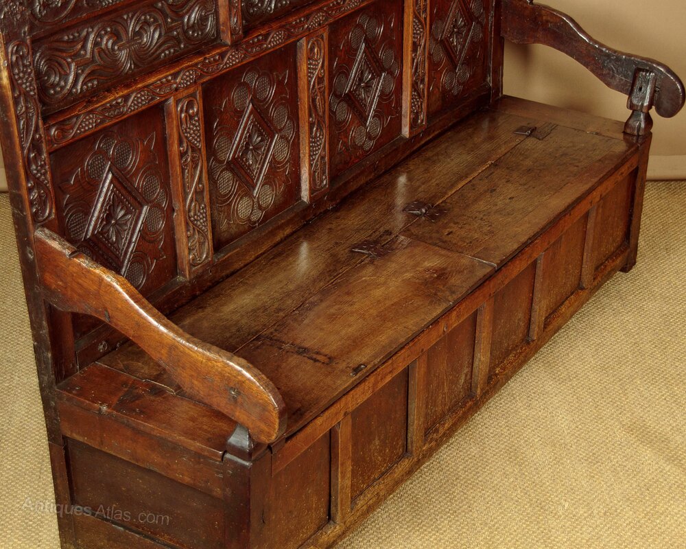 English 18thc Antique Tavern Settle – Carved Witch Device
