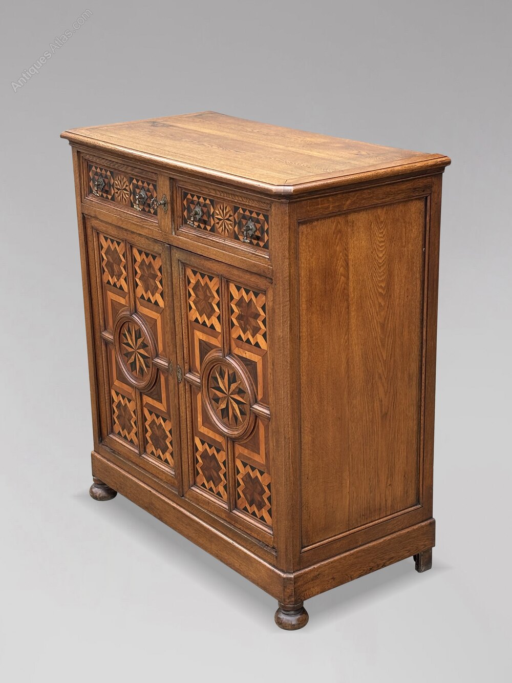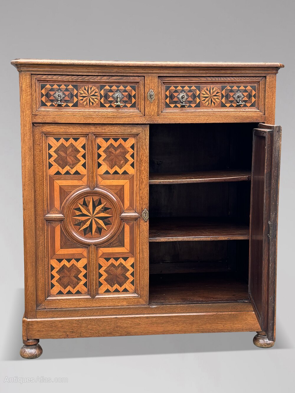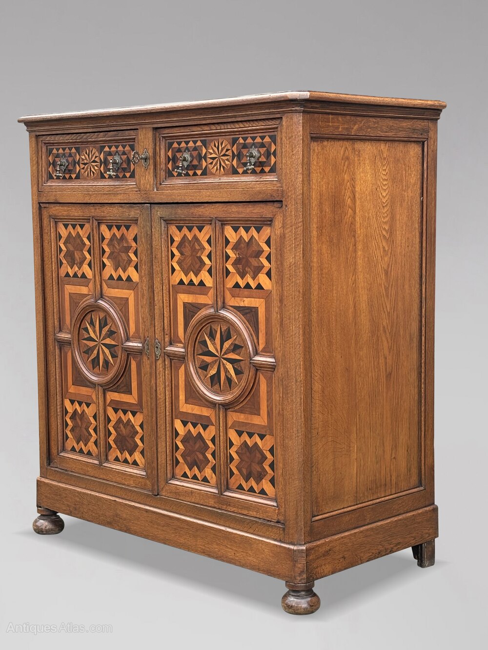 The cupboard features a rectangular moulded top above two drawers, both of which are secured with a single lock. The drawers are richly inlaid with geometric patterns and fitted with original, beautifully shaped brass handles and carved lock escutcheons, situated above two lockable cupboard doors eclosing two shelves. The moulded doors showcases a complete surface of parquetry and marquetry inlays, abstract veneers of kingwood, olive wood, and other fine timbers set in contrasting patterns and geometric frames. The front stands on classic bun feet, and the piece retains its original working locks and keys.