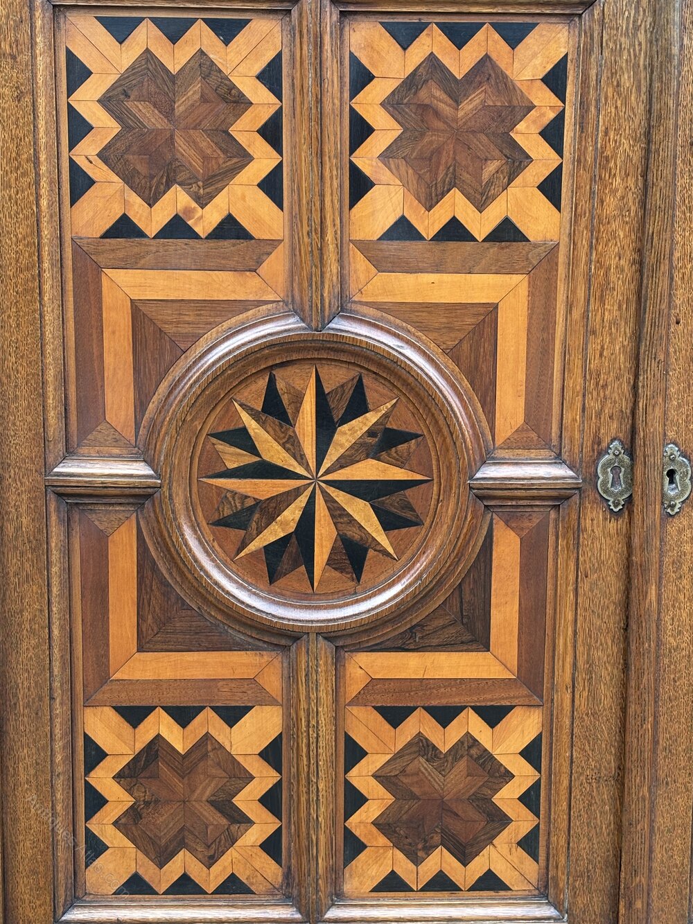 This 18th-century French provincial parquetry and marquetry inlay cupboard is a rare and striking example of craftsmanship.