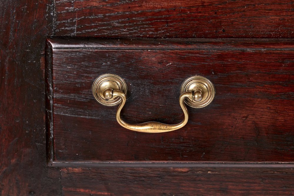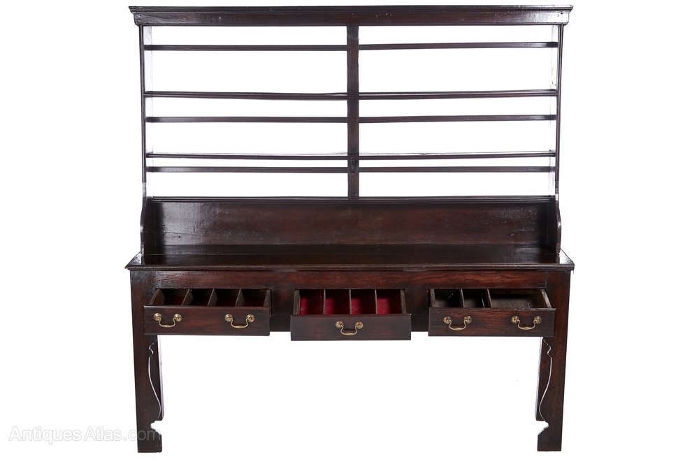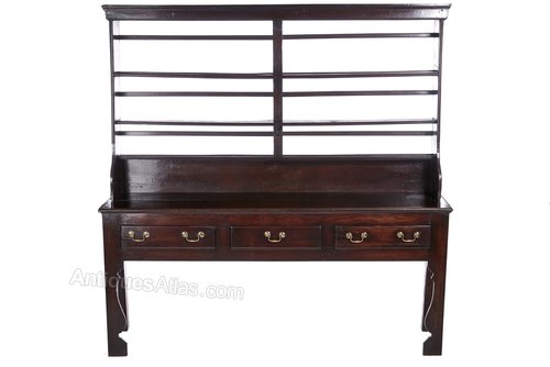 Fine 18th century antique oak Welsh dresser and plate rack having an original plate rack and standing on a three drawer oak dresser base. The oak top is beautiful and it boasts unusual attractive legs.