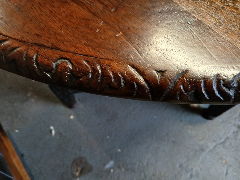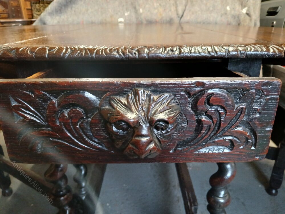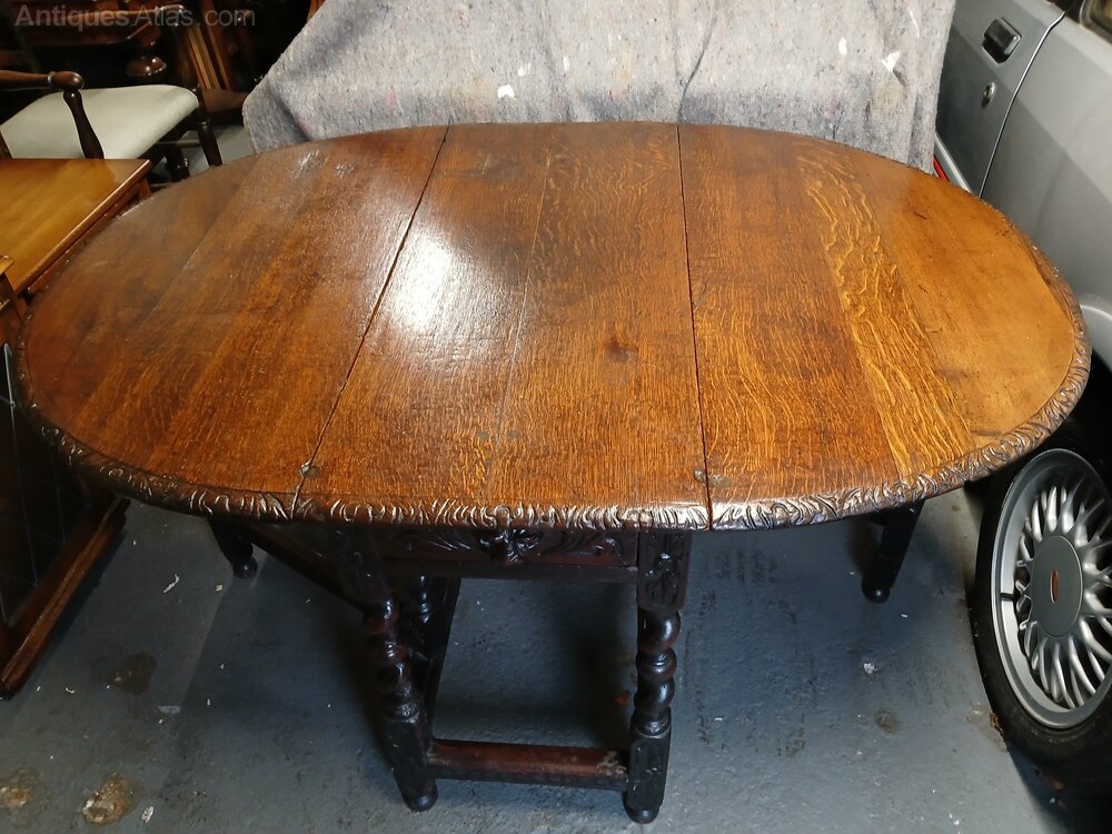 A very nice 18th Century Carved Oak Drop Leaf Table with loads of original Carving. Very well made even the drawer has handcut Dovetails and an oak base. In excellent condition. Lovely detail on this table as seen in the images. Complete with draw.