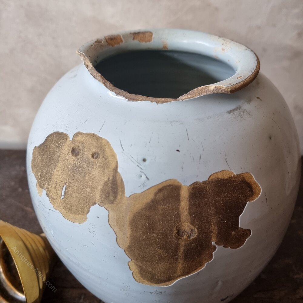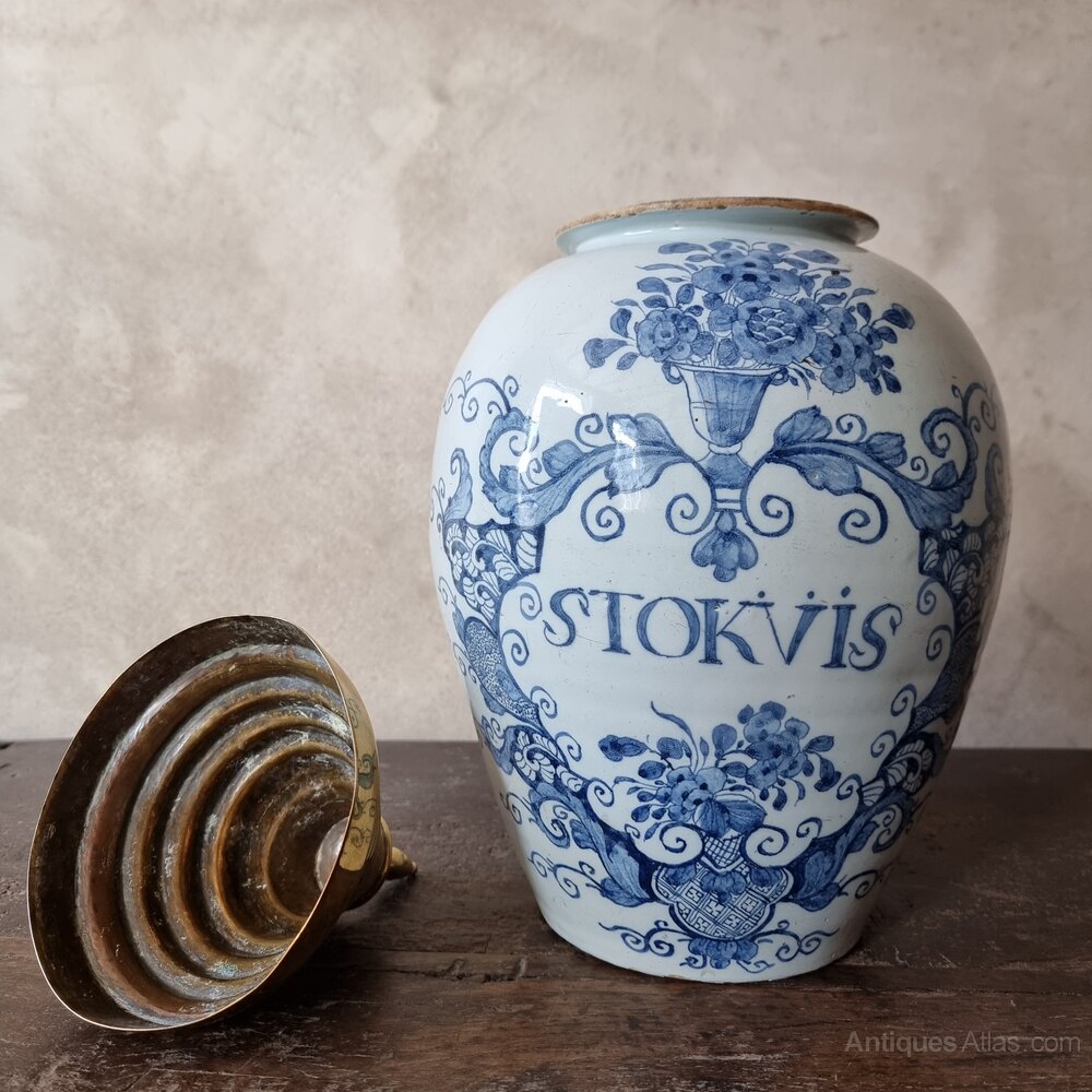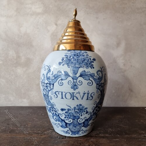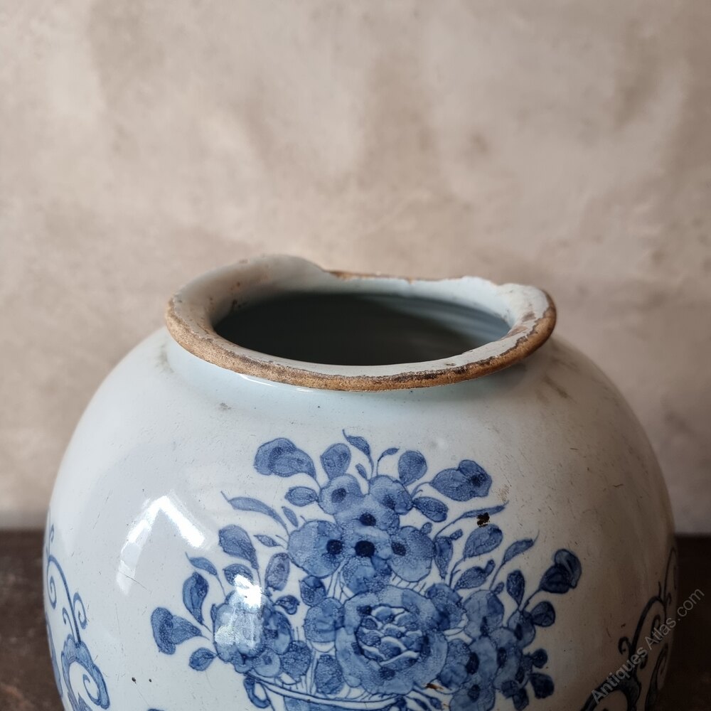 The tobacco jar is in fair condition for its age, it has some losses to the rim and a couple of patched of glaze are missing, the finial at the top of the lid has also been repaired at some stage. although there are a couple of losses there are no cracks in the body of the vessel. It's a nice piece to own for anyone who collect delft and these examples look fantastic displayed on early oak furniture.