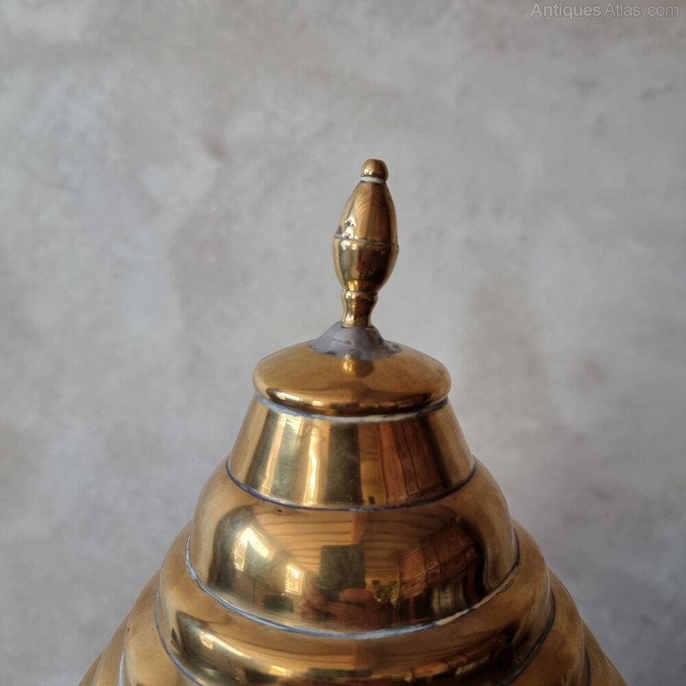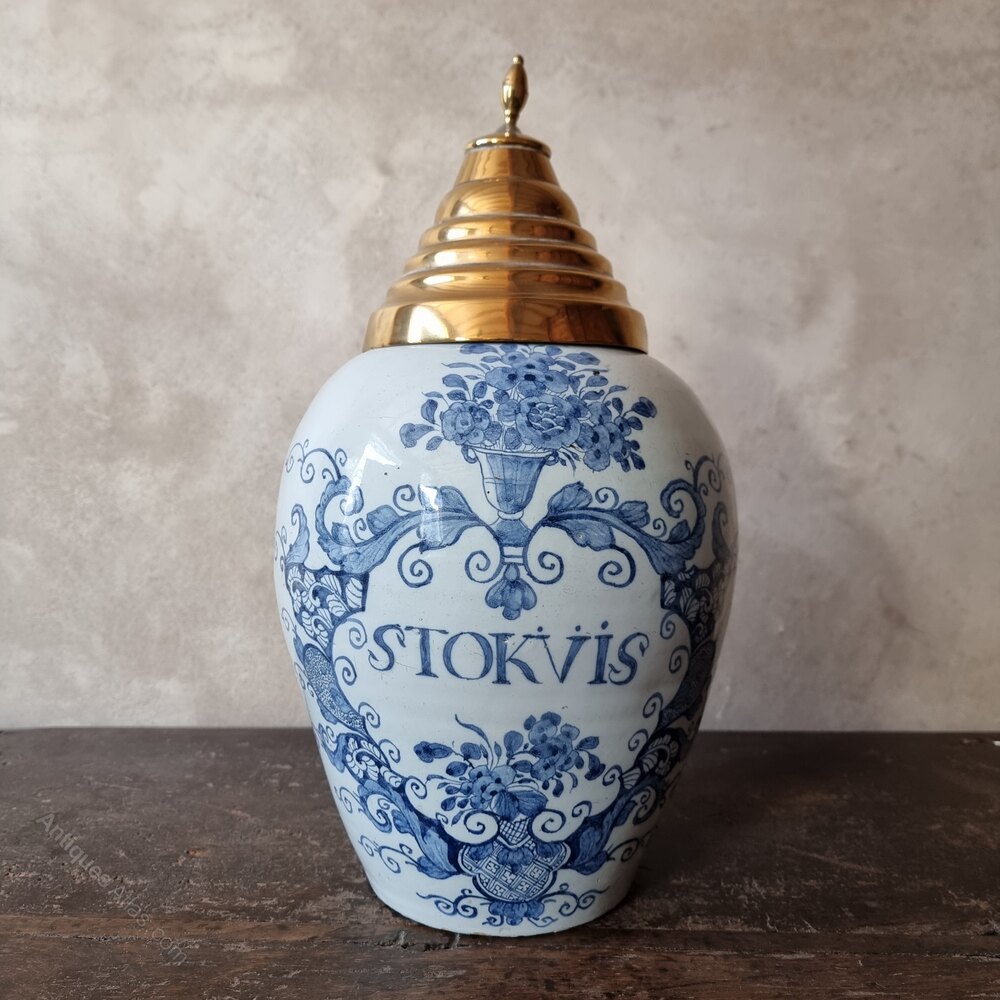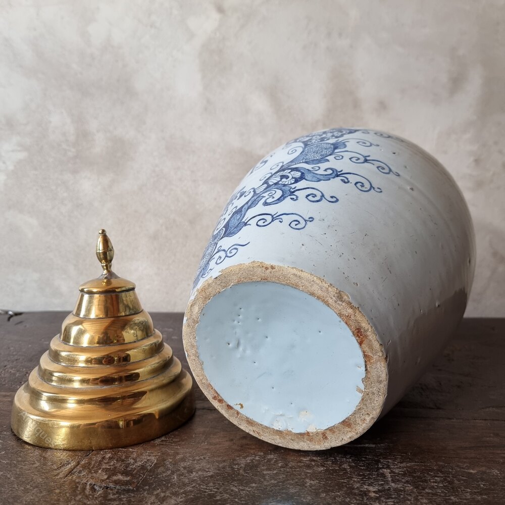 A 18th century Dutch delft tobacco jar with blue and white decoration and complete with its brass lid.