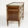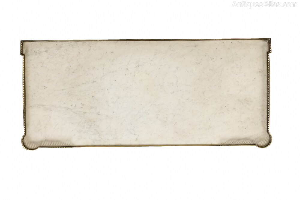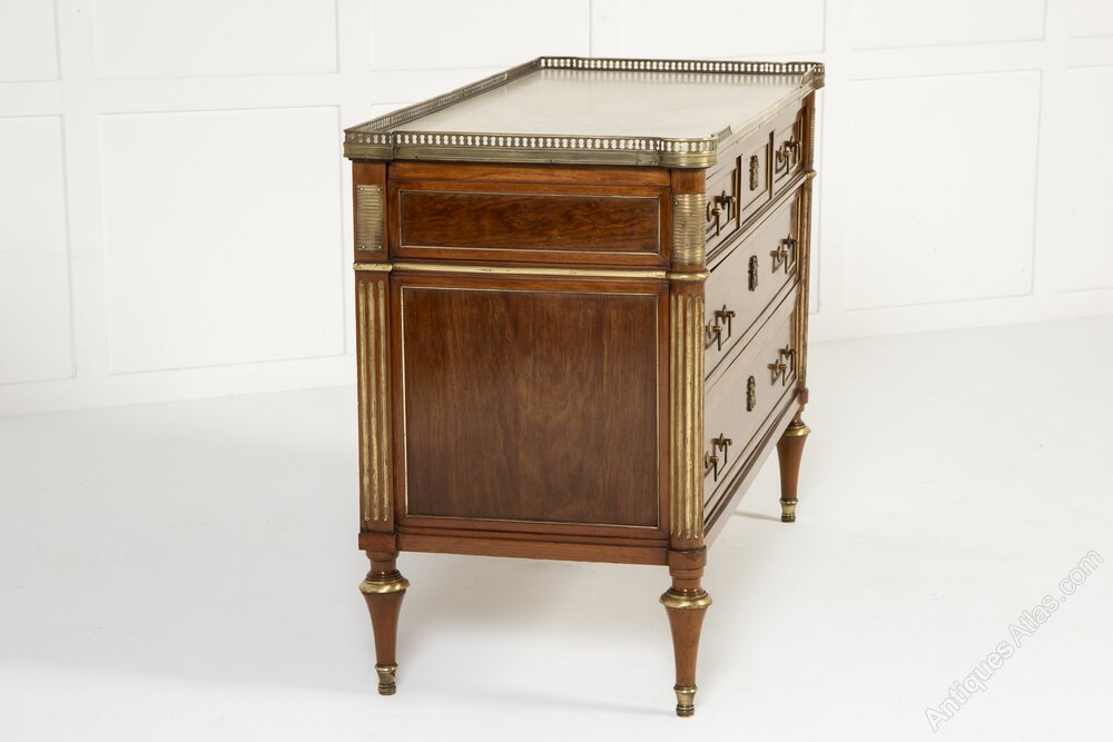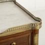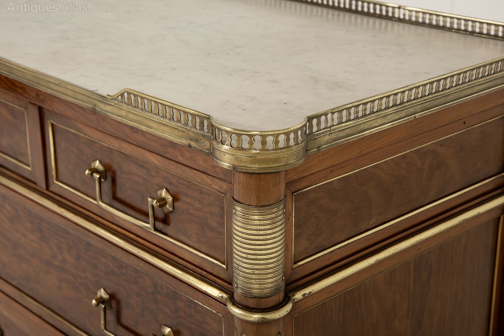 The top has a fretted gallery above a slab of inset white marble. The outset column pilasters to the sides lead down to toupie feet with various ormolu mounts throughout. The figured mahogany is of plum pudding type with attractive figuring. The panelled sides have additional ormolu mounts and the drawers have drop bar handles and ribbon tie escutcheon plates.