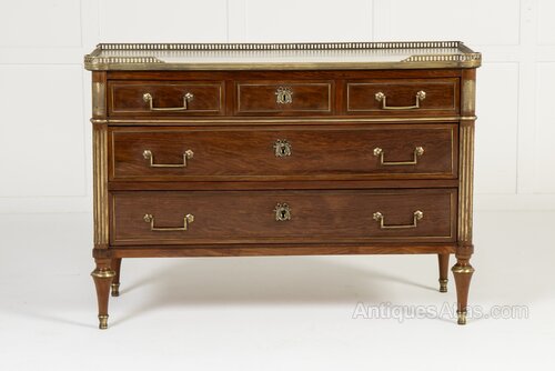18th Century French Mahogany Commode with Inset Marble and Brass Gallery.