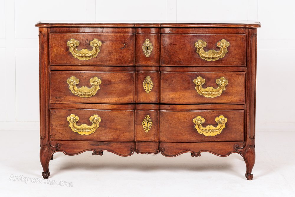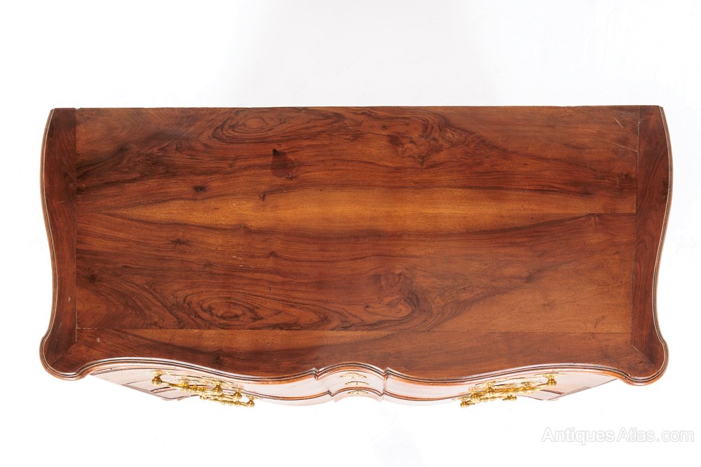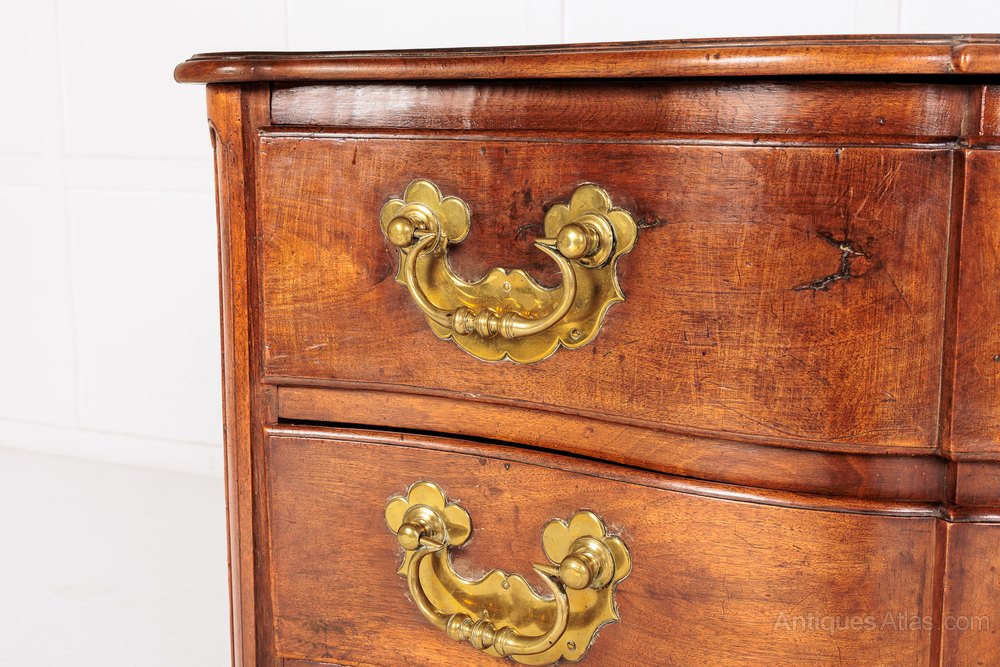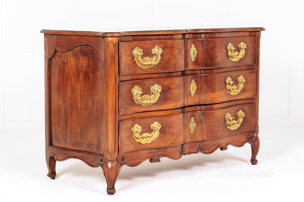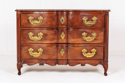 A beautiful 18th Century French walnut commode with serpentine front. The shaped overhanging top above three ripple moulded drawers with amazing, elaborate large scale original handles and escutcheons. Having nicely moulded panelled sides and canted, moulded front corners. Carved shaped apron to front and sides. Raised on short cabriole legs and carved scroll feet.