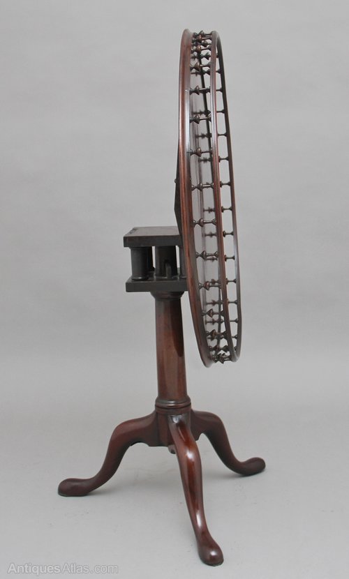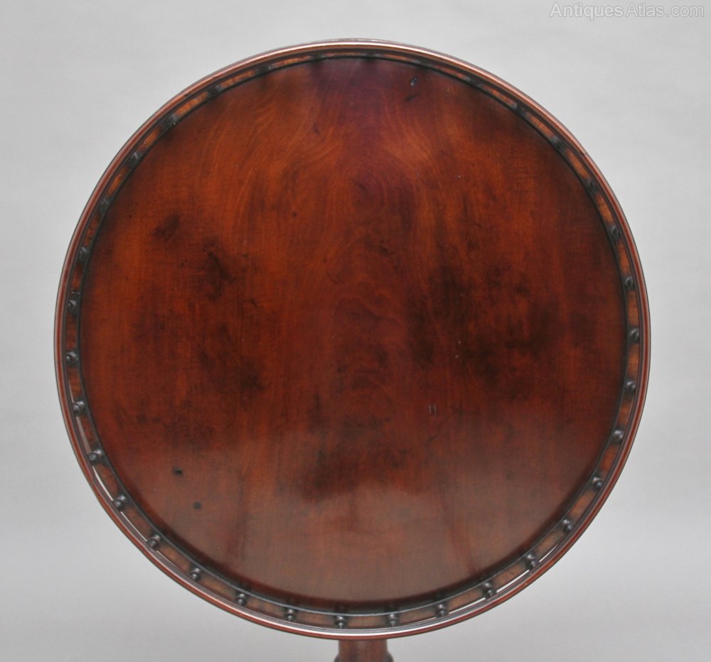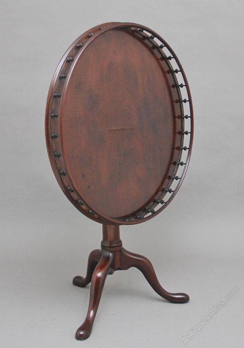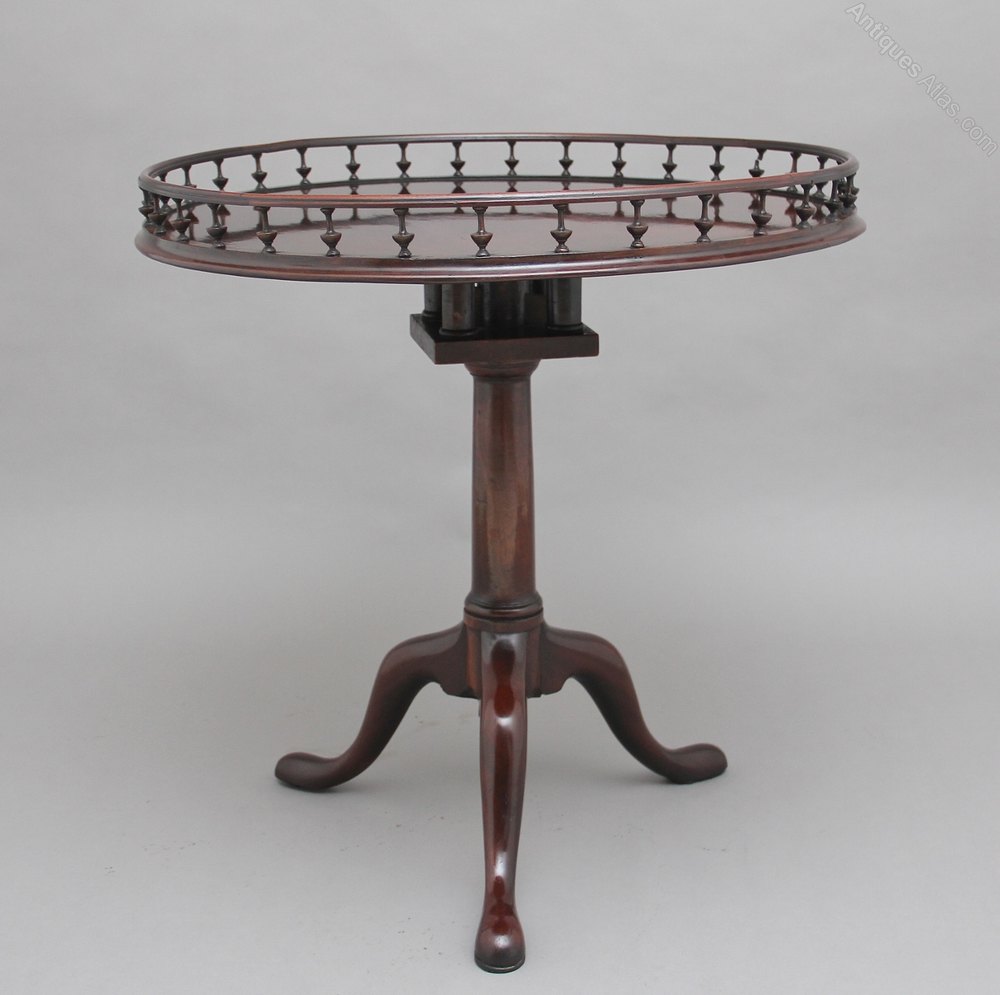 18th Century mahogany tripod table, having a wonderfully figured top decorated with a gallery around the edge, the gallery consisting of various turned spindles, supported on a turned column terminating with three slender shaped legs. In fantastic condition and having a lovely mahogany colour. Circa 1780.