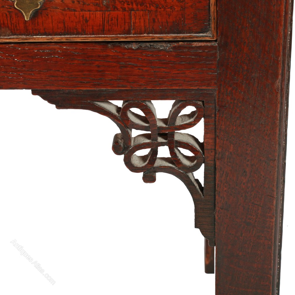 The low boy has square legs with a moulded outer edge and fret work in the top corner of the front legs.