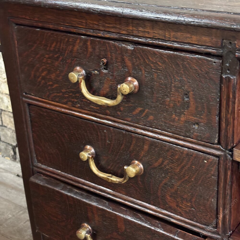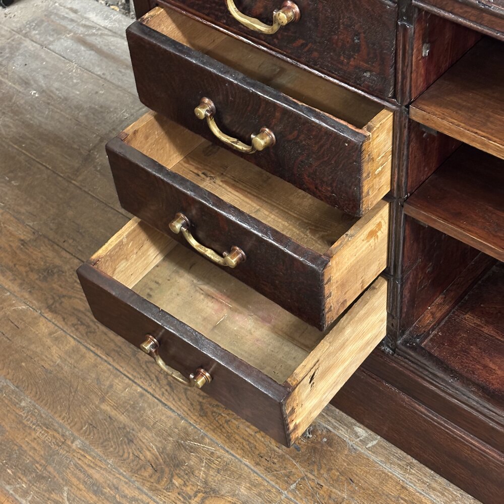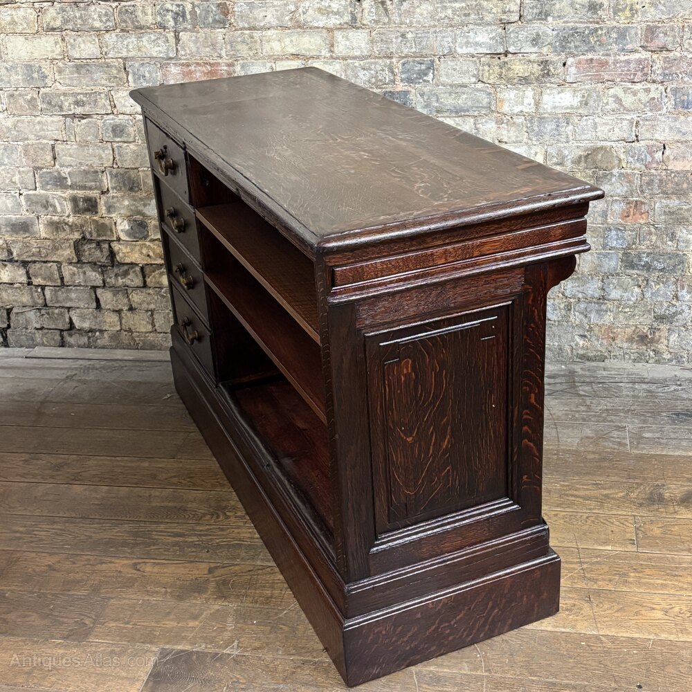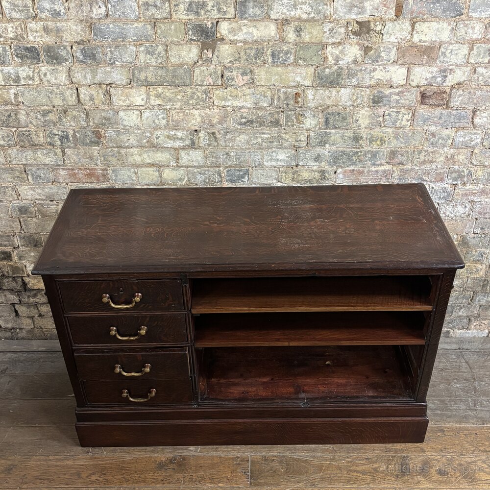 The front showcases four solid drawers with original brass pull handles, offering plenty storage space. To the right, a set of open shelves provides easy access for shop use or an excellent opportunity for visual merchandising.