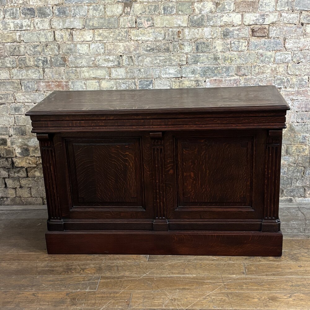 An early 20th-century oak shop counter offers a beautiful balance of form and function. Crafted from richly grained oak, the piece features a warm, dark finish and a well-proportioned layout, ideal for both display and storage.