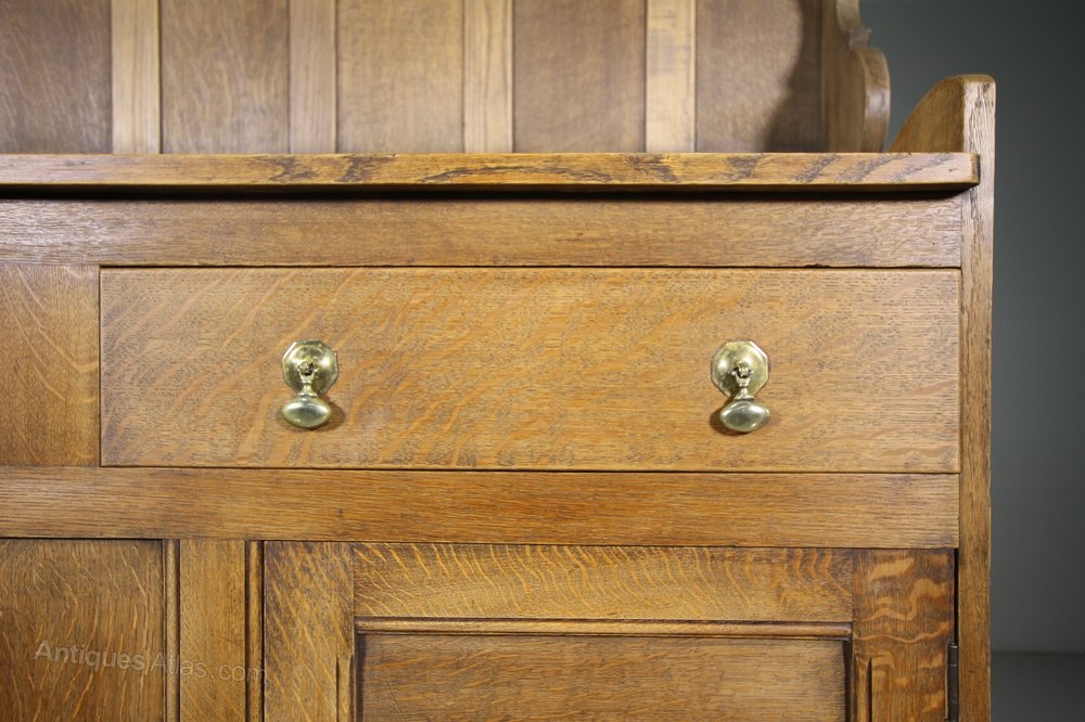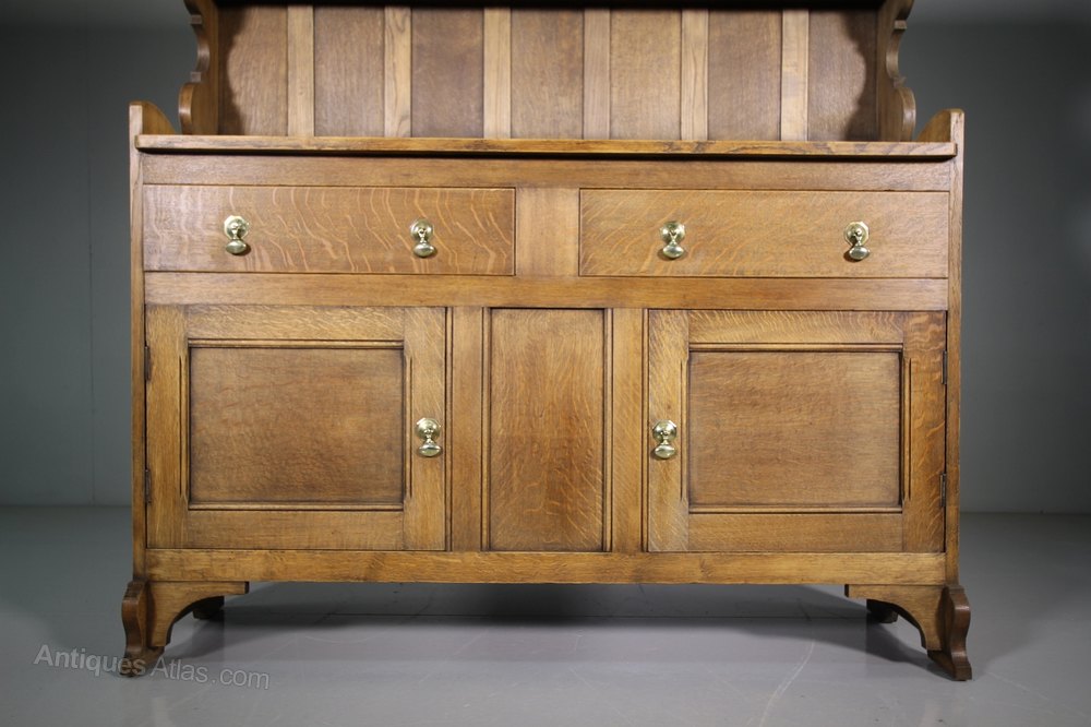 This is a beautifully made, English oak dresser that dates from the twenties, designed by John Stark and is made by Greenings of Oxford, then retailed by Heals of London. A lovely size, in excellent clean and solid condition. This English solid oak dresser splits into two sections, the top is an open, shaped display rack with the dresser base having two drawers over two cupboard doors. In the original finish, complete with the original brass handles. All totally original, a good quality Heals oak antique furniture made for them by Greenings of Oxford in the twenties.