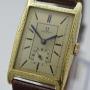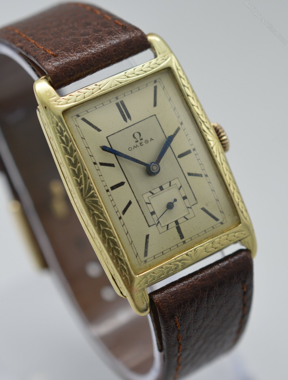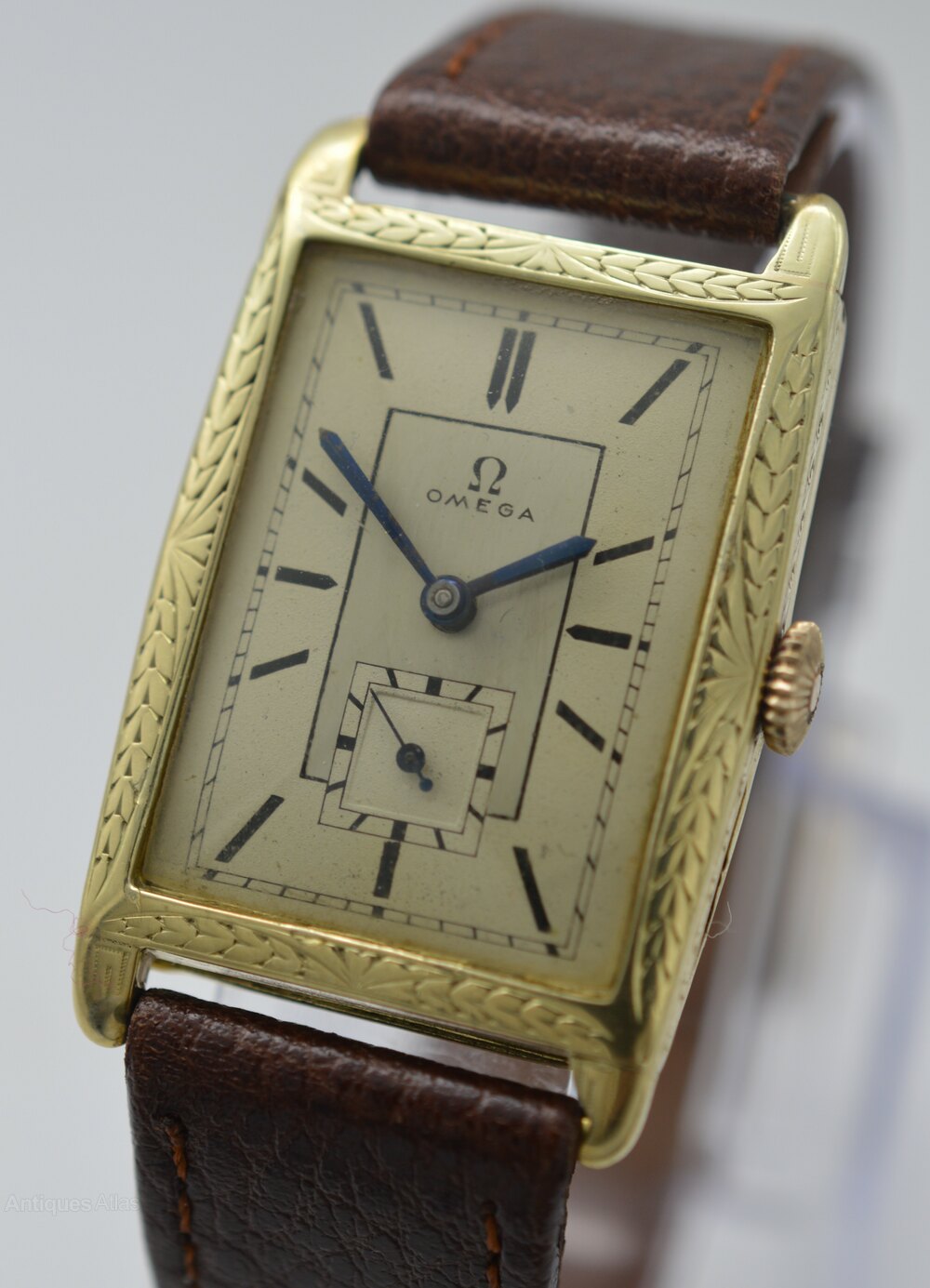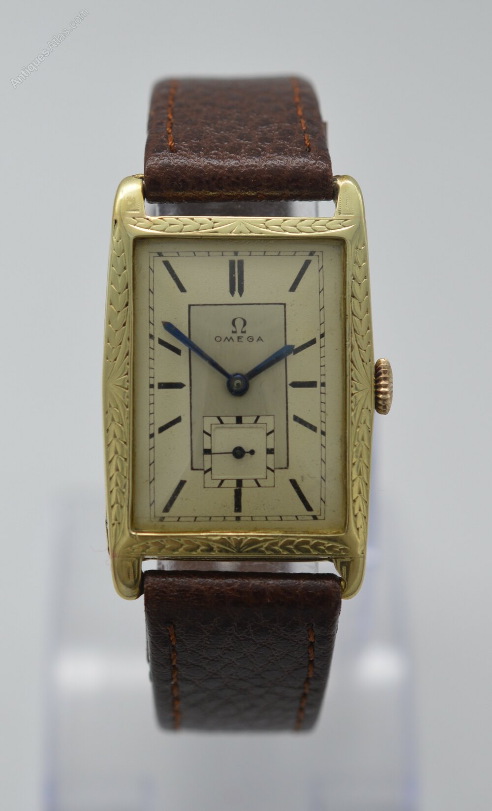 A 1925/26 Omega 18K gold wristwatch. A two-tone dial finish with a lightly reflective central rectangular area, surrounded by a matte silver finish to the rest. The minute and hours are marked by black strips in a concentric form, doubled at 12 o'clock. A subsidiary seconds dial to 6 o'clock, with a recessed centre and a counter-balanced seconds hand. Blued steel variants of 'pencil' hands indicate the hours and minutes.