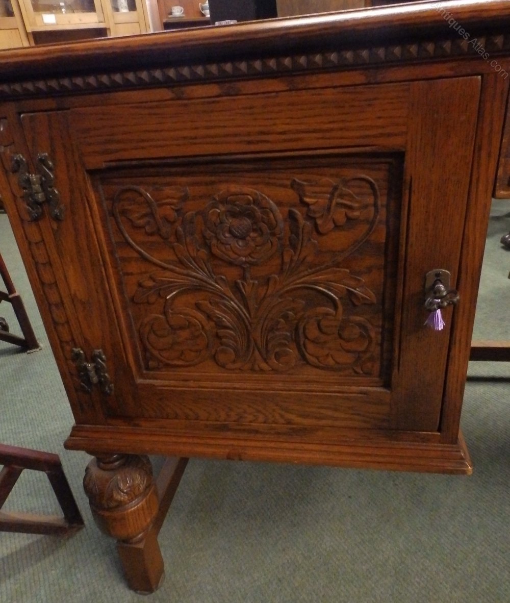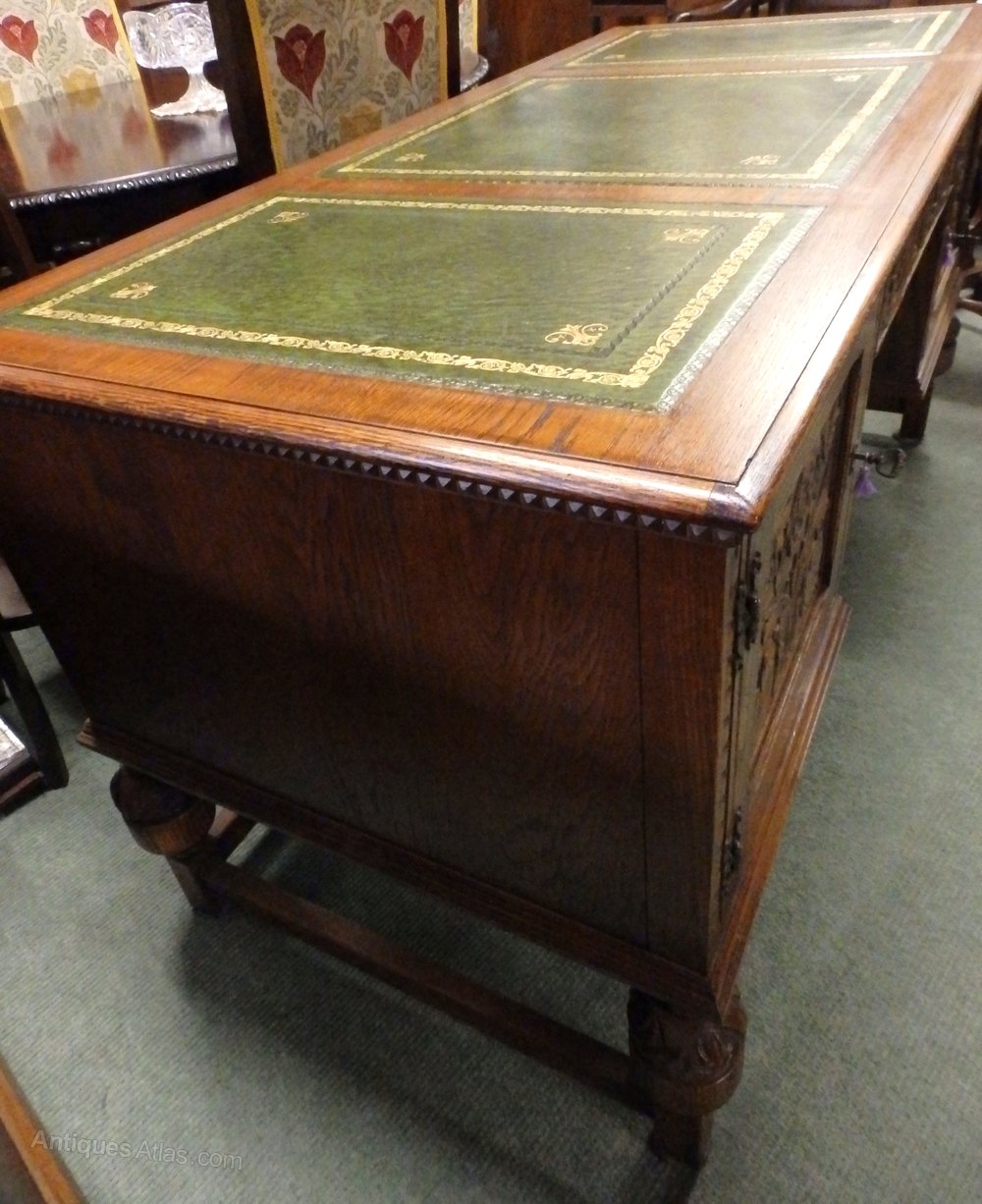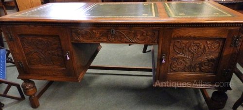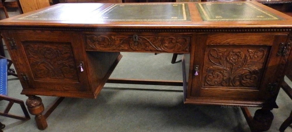 no-55-1930s large oak carved desk (all in one piece) with sliding drawers,working locks&keys in very good condition